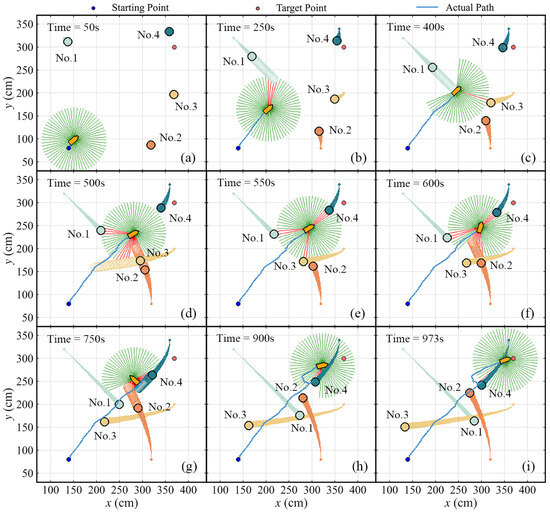 Figure 27 illustrates the schematic representations of the ASV successfully avoiding four dynamic obstacles under the environmental disturbances. Figure 26b presents the variation in distance between the vessel and obstacles over time, with the minimum distances detailed in Table 7. The initial position of the vessel is (140 m, 80 m), and the destination is set at (370 m, 300 m). The data indicate, that prior to 250 s, the vessel proceeds directly towards its target. At 400 s, with the virtual obstacles detected, the vessel sightly changes its heading. By 500 s, predictions were made for the trajectories of obstacles No.2 and No.3, and the ship maneuvers to avoid the imagined obstacles, finally bypassing No.2 and No.3 at 550 s. Then, the ship encounters obstacle No.4, and it preemptively maneuvers to avoid the predicted trajectory of the obstacle, navigating to the right side of No.4, while approaching the target point. At 839.5 s, the vessel reaches its closest proximity to the No.4 obstacle.