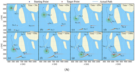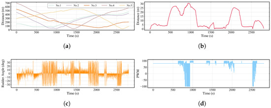 Figure 28 shows the simulation results at each specific time step. Figure 29 provides data regarding the distances between the ASV and other obstacles, the distance between the ASV actual path and global path, and the rudder angle and propeller PWM over time. The minimum distances can be found in Table 8. At the beginning, a global path avoiding static obstacles is provided. Prior to 450 s, the vessel executes the path-following mode with a constant propeller PWM. Due to environmental disturbances, there is a stable path error around 5 m. After 450 s, the vessel turns right to avoid No.1, thus completing the crossing in front of No.1 eventually. At 665 s, the minimum distance between the two is 76.321 m. Later, at 750 s, the vessel encounters obstacle No.2. The vessel also turns right to avoid it, with the minimum distance at 989.5 s being 37.078 m, and successfully avoids No.2 after 1050 s. At 1350 s, the vessel is positioned directly in front of obstacle No.4. At this time, the ASV continues its forward navigation, passing directly in front of No.4, with the minimum distance to No.4 being 30.866 m. After 1950 s, the vessel is situated behind obstacle No.3, and at 2100 s, it passes between the static obstacle and No.3, subsequently switching to the path-following mode and gradually approaching No.5. At 2550 s, the vessel executes a right turn to avoid an impending obstacle. At 2650 s, the distance between the two is 25.081 m. Finally, at 2806.5 s, the vessel successfully arrives at the target point.