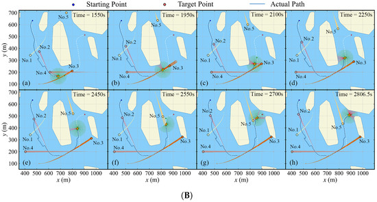 The general views of the ASV navigating in a complex environment. (A) The navigation between 50 s and 1400 s. (B) The navigation between 1550 s and terminal time step.