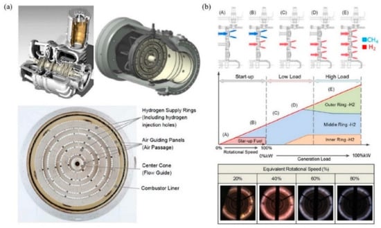 In response to equipment retrofitting demands, gas turbine manufacturers worldwide are focused on enabling high hydrogen combustion in heavy-duty gas turbines. Siemens Energy & Power Transmission Group aims to have 100% hydrogen-fueled gas turbines available by 2030 [,]. Details on the progress of the joint GE (General Electric) and U.S. Department of Energy (DOE) High Hydrogen Turbine Program can be found in Ref. []. Mitsubishi Power has been involved in hydrogen/ammonia-firing Gas Turbine Combined Cycle (GTCC) projects []. With support from Japan’s New Energy and Industrial Technology Development Organization (NEDO), a gas turbine combustor capable of operating with a mixture of natural gas and up to 30% hydrogen by volume has been proposed for large-scale gas turbines [].