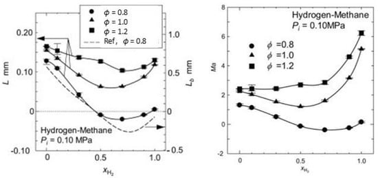 Markstein length (left) and Markstein number (right) of different hydrogen contents []. The means Markstein length .
