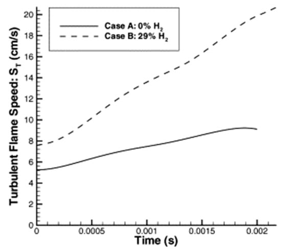 A DNS study [] comparing the turbulent consumption speed of lean premixed flames with varying hydrogen fractions, as shown in Figure 12, reveals that hydrogen-fueled flames exhibit higher velocities than pure methane flames. After 2 ms (two vortex transition turnover cycles), the velocity difference can be as much as twofold. The higher turbulent consumption speed enhances the flame’s resistance to flashback and promotes stable combustion. Hydrogen enrichment leads to increased turbulence intensity.