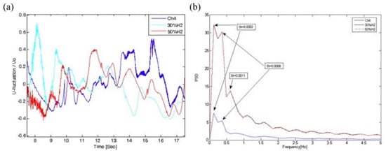 Axial velocity fluctuations in the wrinkled flame location: (a) fluctuations, (b) spectra (12.5–17.5 s). means inlet velocity. . Replotted from Ref. [].