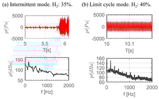 At higher hydrogen concentrations, mode switching between acoustic resonant frequencies occurs, a phenomenon widely reported by researchers in Korea [,,,,,]. As shown in Table 4, high hydrogen contents tend to trigger a shift in fluctuation frequency from a lower mode to a higher one, with peak frequencies reaching up to seven times the original frequency. This phenomenon, known as frequency/mode switching (FMS) [,], is a common result of significant hydrogen enrichment.