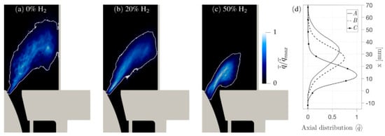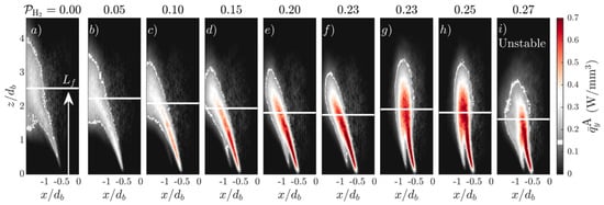 The increased flame temperature in hydrogen-enriched methane flames has been widely documented in Refs. [,]. At an equivalence ratio of 0.5, increasing the hydrogen content from 20% to 80% raises the adiabatic flame temperature from 1670 K to 1745 K []. Similarly, in a turbulent non-premixed diffusion model combustor [], the overall flame temperature increases from 1125 K in methane combustion to 1372 K in hydrogen combustion.