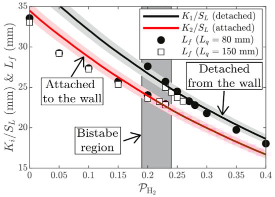 The results in Figure 11 [] show that a negative Markstein length appears in hydrogen fractions between 0.5 and 0.9, indicating flame instability. The changing sign of the Markstein length suggests a more pronounced response of the mixture to flame stretch. Given hydrogen’s higher laminar burning velocity, the addition of hydrogen increases flame instability, making the combustion process more difficult to control.