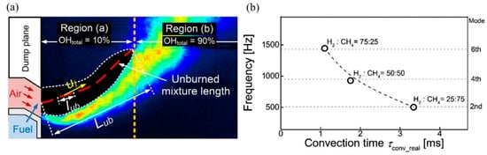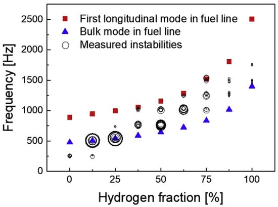 A typical correlation between oscillation frequency and hydrogen fractions is illustrated in Figure 14 []. The oscillation frequencies increase almost linearly, progressing from the 1st to the 7th acoustic resonant frequency of the combustor as hydrogen content gradually rises. The dominant characteristic time scale in premixed combustion—convection time—shortens with hydrogen enrichment, which is the key factor driving frequency/mode switching (FMS).
