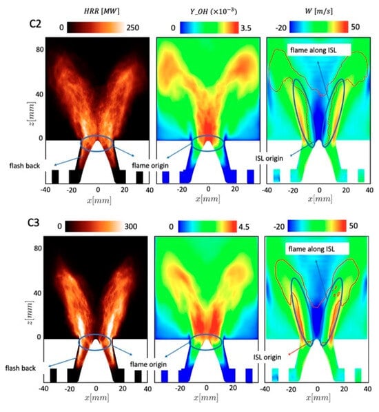 Due to its shorter ignition delay time, hydrogen is prone to spontaneous ignition in the premixed section without an external ignition source [,]. This can occur across a wide range of operating pressures, making premixed combustors unsuitable for high hydrogen combustion for safety reasons.