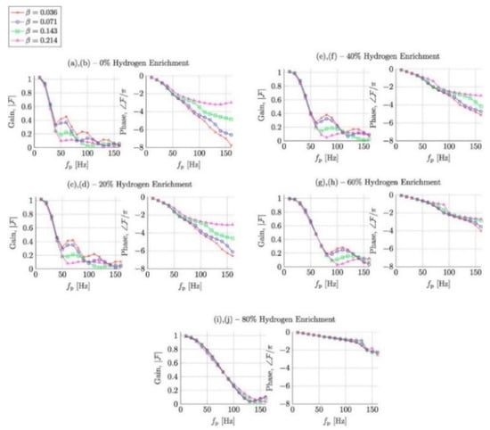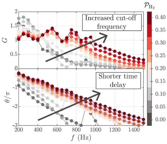 The effects of hydrogen addition on oscillation frequency can vary. In some articles on lean premixed (LPM) combustion with low hydrogen content (<20%) [,,], hydrogen-enriched methane flames exhibit similar oscillation frequencies to those of pure methane flames, with hydrogen enrichment primarily influencing the amplitude of oscillations. However, as hydrogen content increases to around 40%, a slight rise in oscillation frequency is observed. For example, a 10% increase in hydrogen by volume induces a frequency shift to higher modes, within 5% of the original frequency []. This slight frequency shift is attributed to the reduced convection time caused by hydrogen addition.
