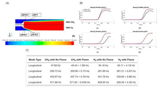 It is worth noting that in numerical simulations, the Lewis number of fuel mixtures is often assumed to be one to improve the computational efficiency of Direct Numerical Simulation (DNS) and Large Eddy Simulation (LES) []. As shown in Table 3, this assumption is feasible for methane combustion; however, for hydrogen combustion, it is essential to compare appropriate combustion models and apply precise reaction mechanisms due to hydrogen’s distinct properties.