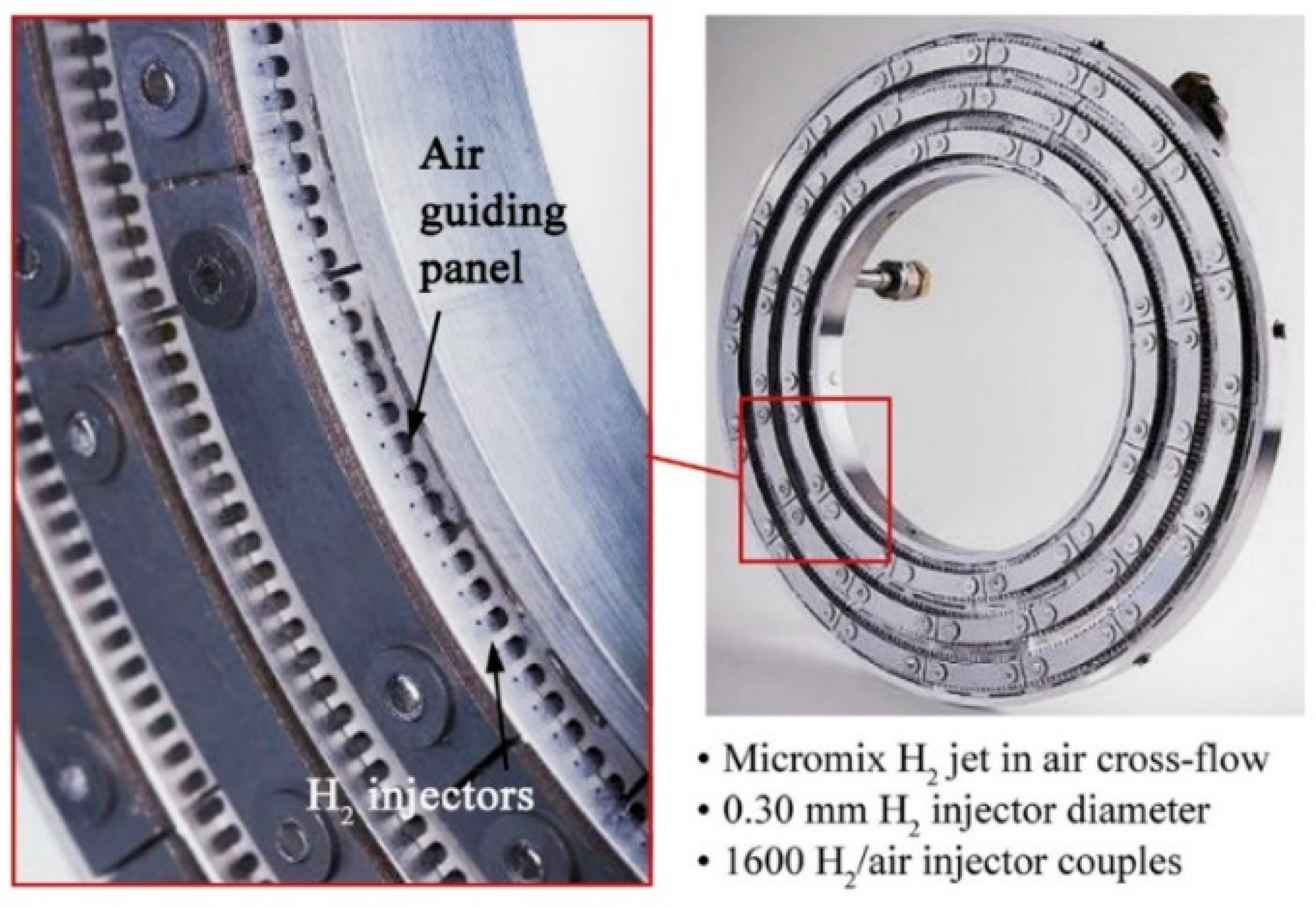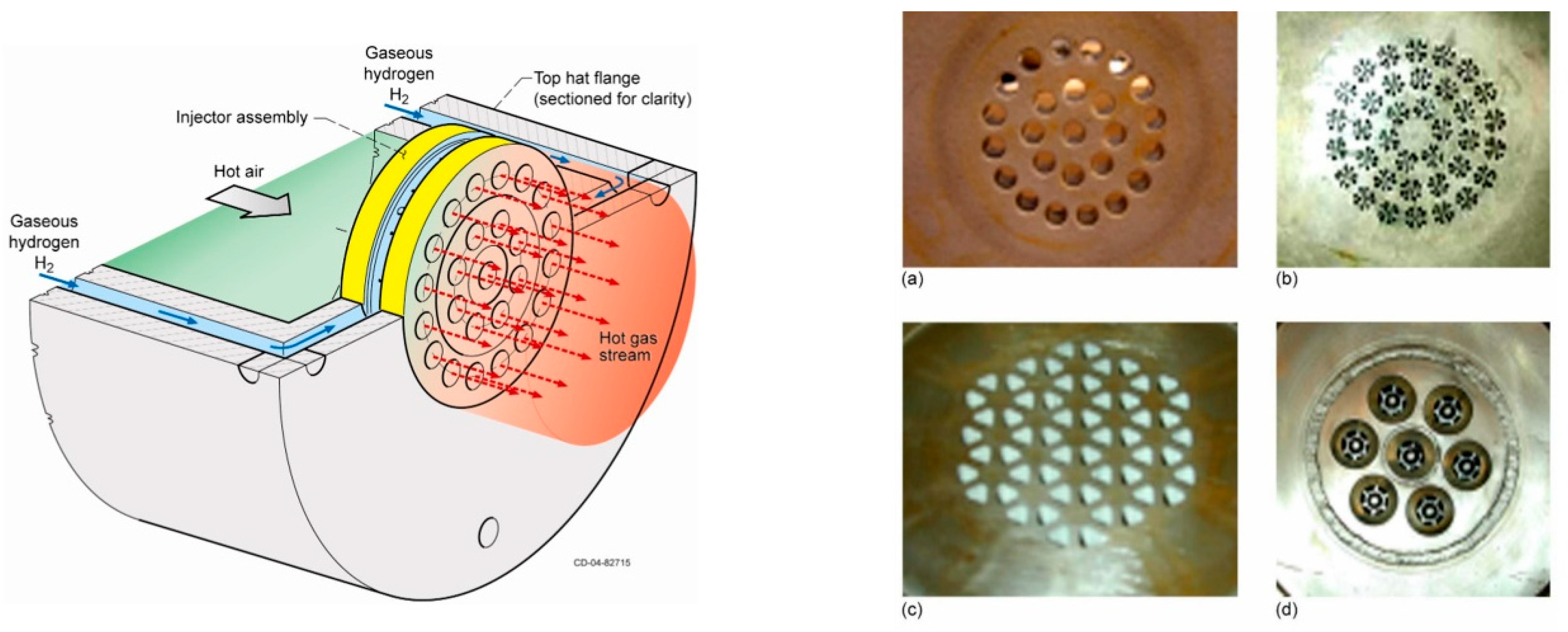 - Johannes, B. Scaling of an aviation hydrogen micromix injector design for industrial GT combustion applications. Aerotec. Missili Spaz. 2021, 100, 239–251. [Google Scholar] [CrossRef]