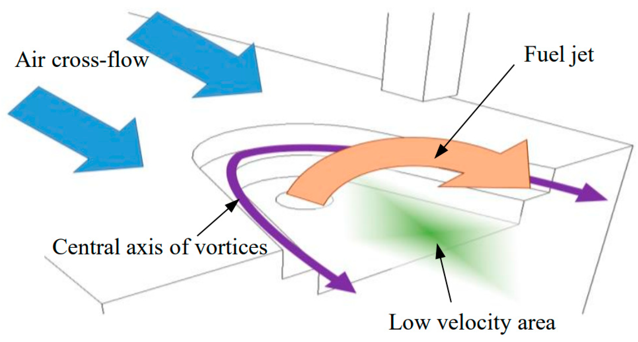 - Zhao, D.; Gutmark, E.; de Goey, P. A review of cavity-based trapped vortex, ultra-compact, high-g, inter-turbine combustors. Prog. Energy Combust. Sci. 2018, 66, 42–82. [Google Scholar] [CrossRef]