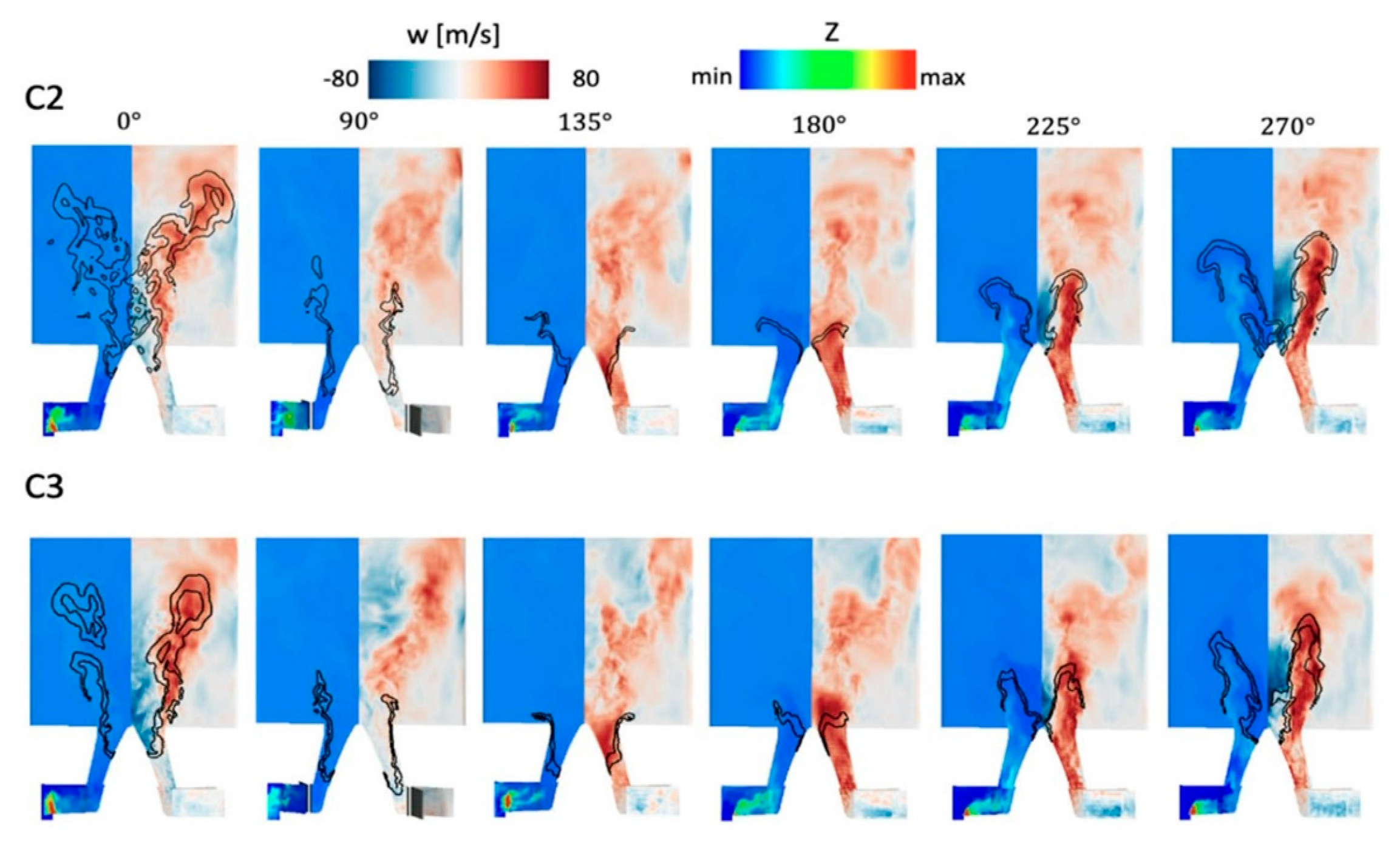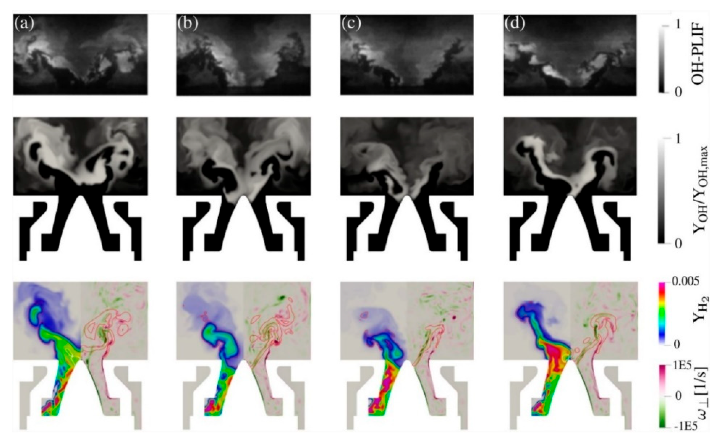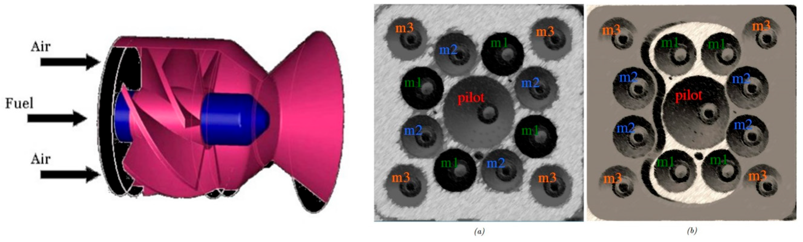 - Kroniger, D.; Horikawa, A.; Okada, K.; Ashida, Y. Novel Fuel Injector Geometry for Enhancing the Fuel Flexibility of a Dry Low NOx MicroMix Flame. In Proceedings of the ASME Turbo Expo 2022: Turbomachinery Technical Conference and Exposition, Rotterdam, The Netherlands, 13–17 June 2022. [Google Scholar]