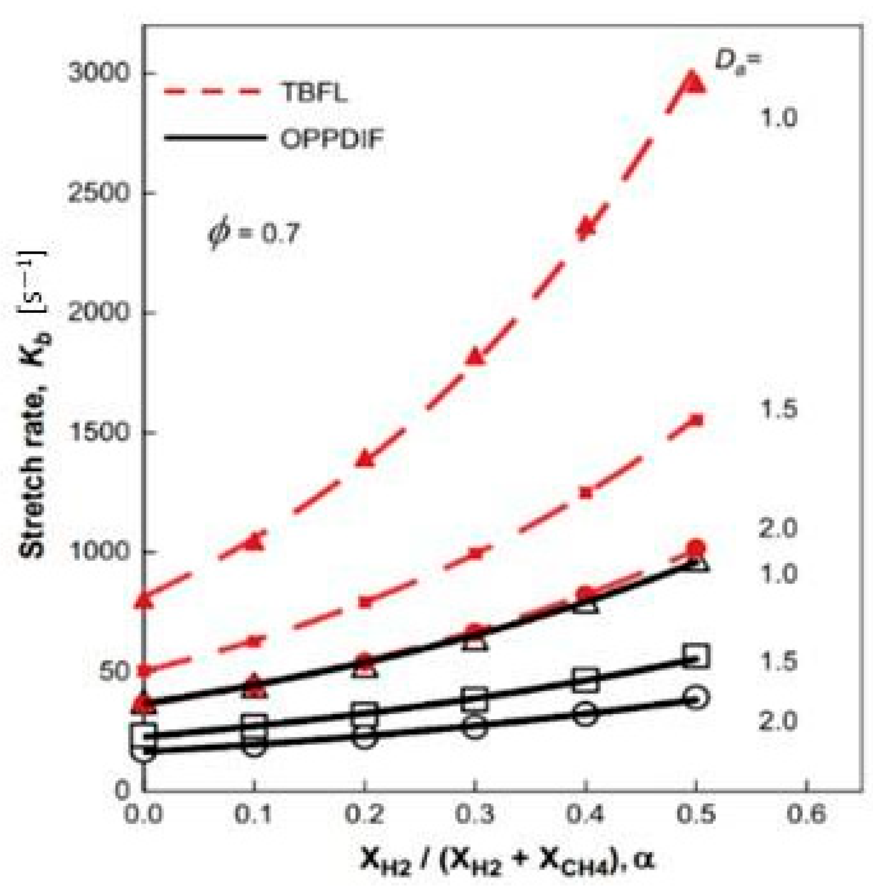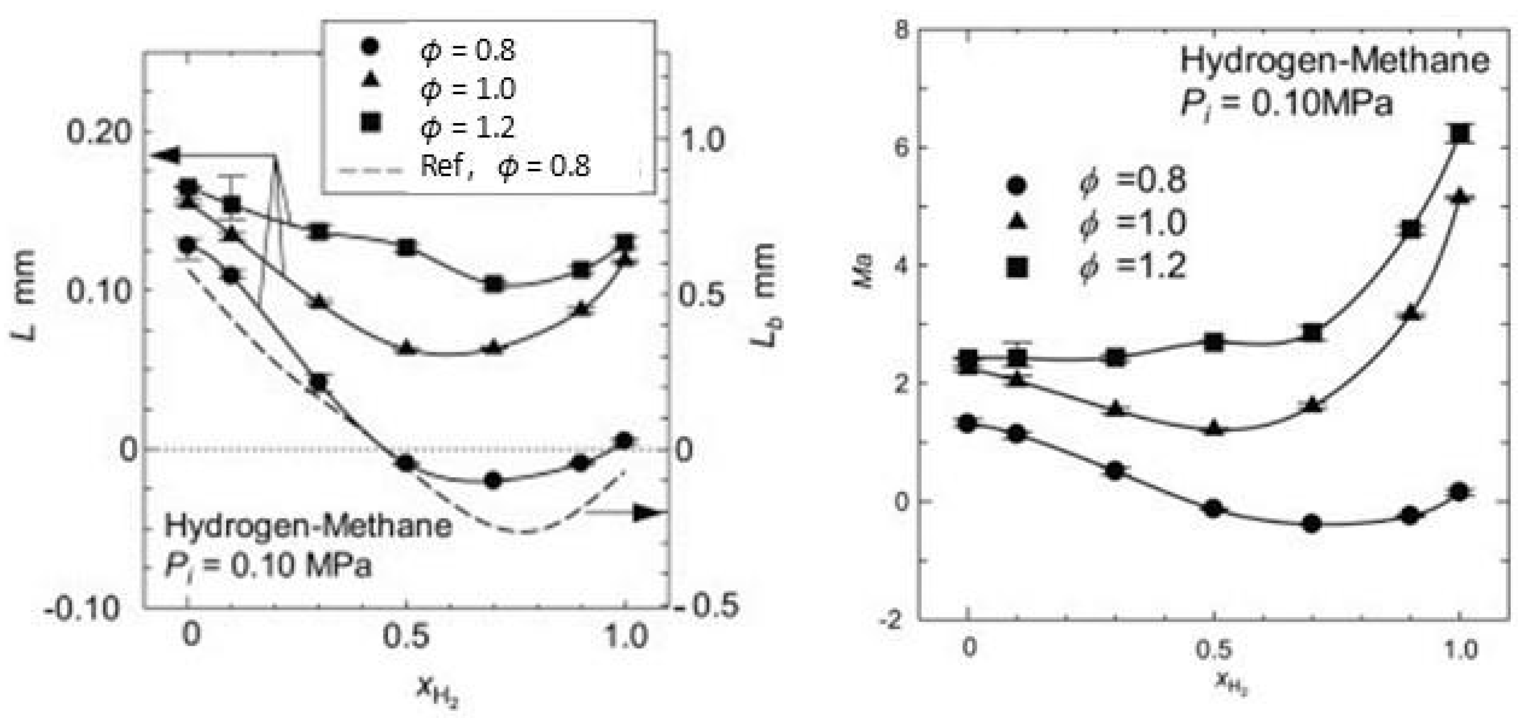 2.2. Hydrogen-Enriched Methane Flame Fundamental Characteristics