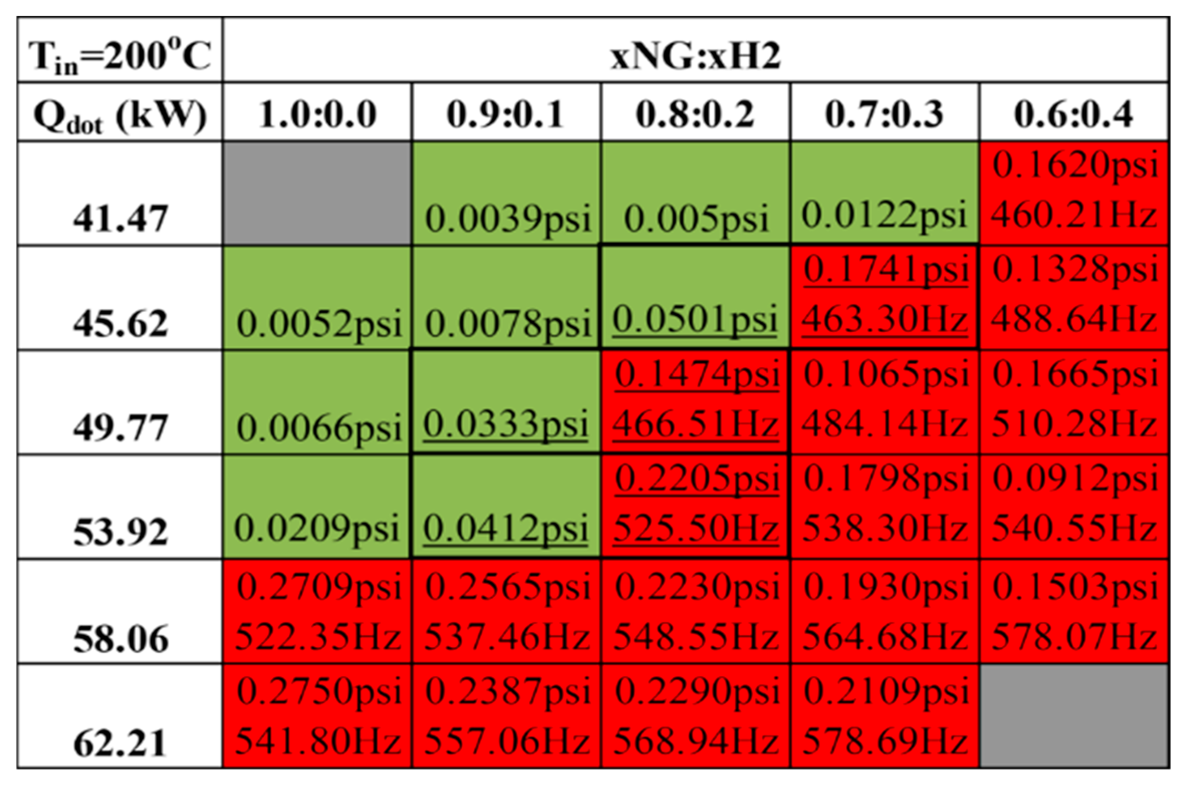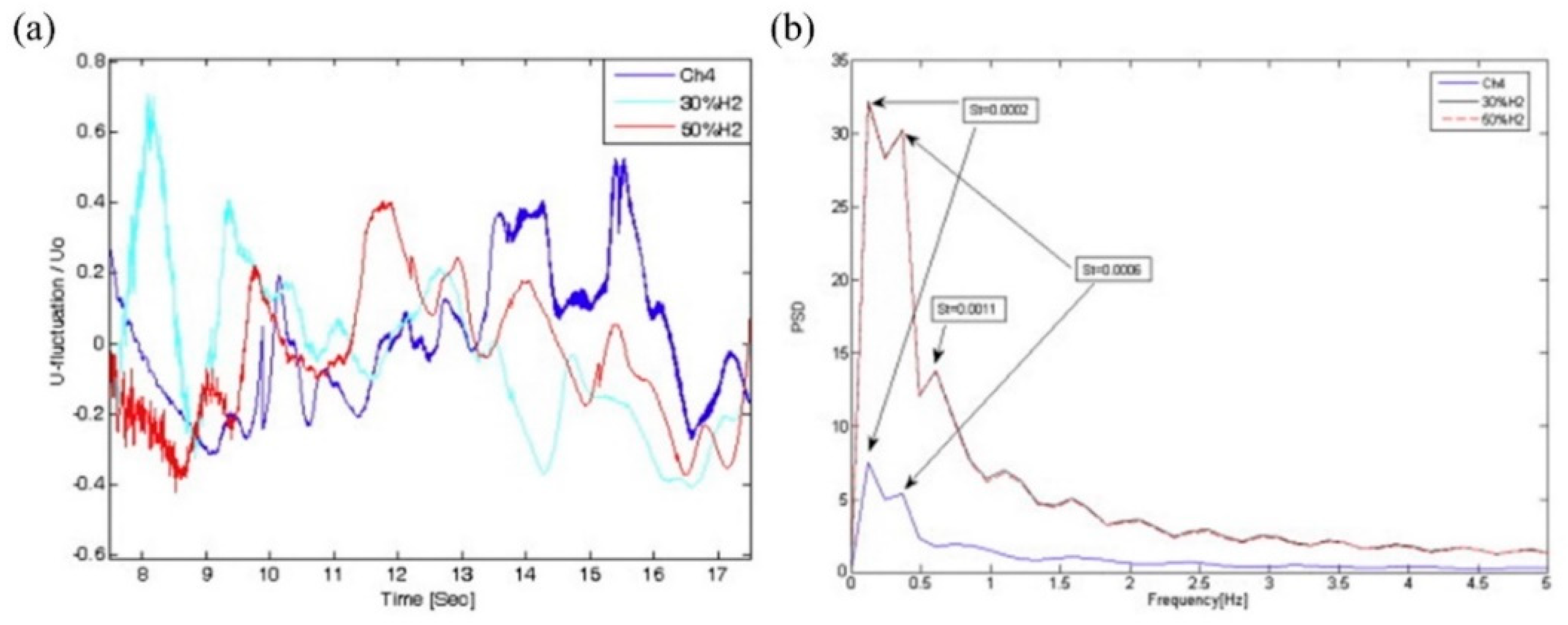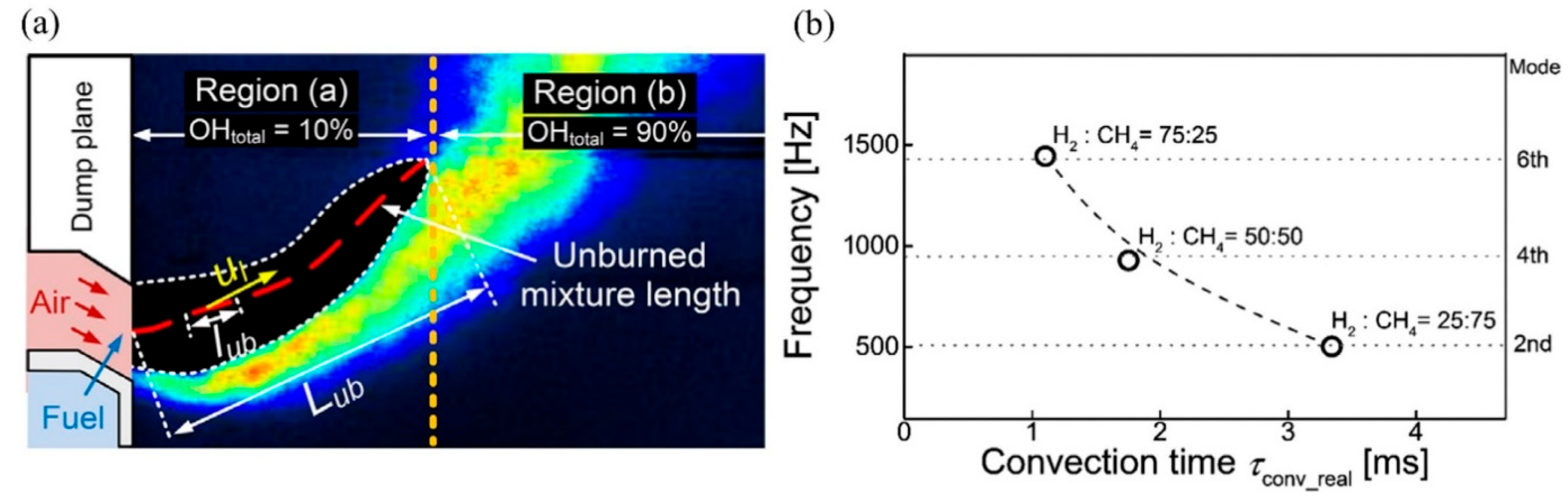 - Park, J.; Lee, M.C. Combustion instability characteristics of H2/CO/CH4 syngases and synthetic natural gases in a partially-premixed gas turbine combustor: Part II—Time lag analysis. Int. J. Hydrogen Energy 2016, 41, 1304–1312. [Google Scholar] [CrossRef]