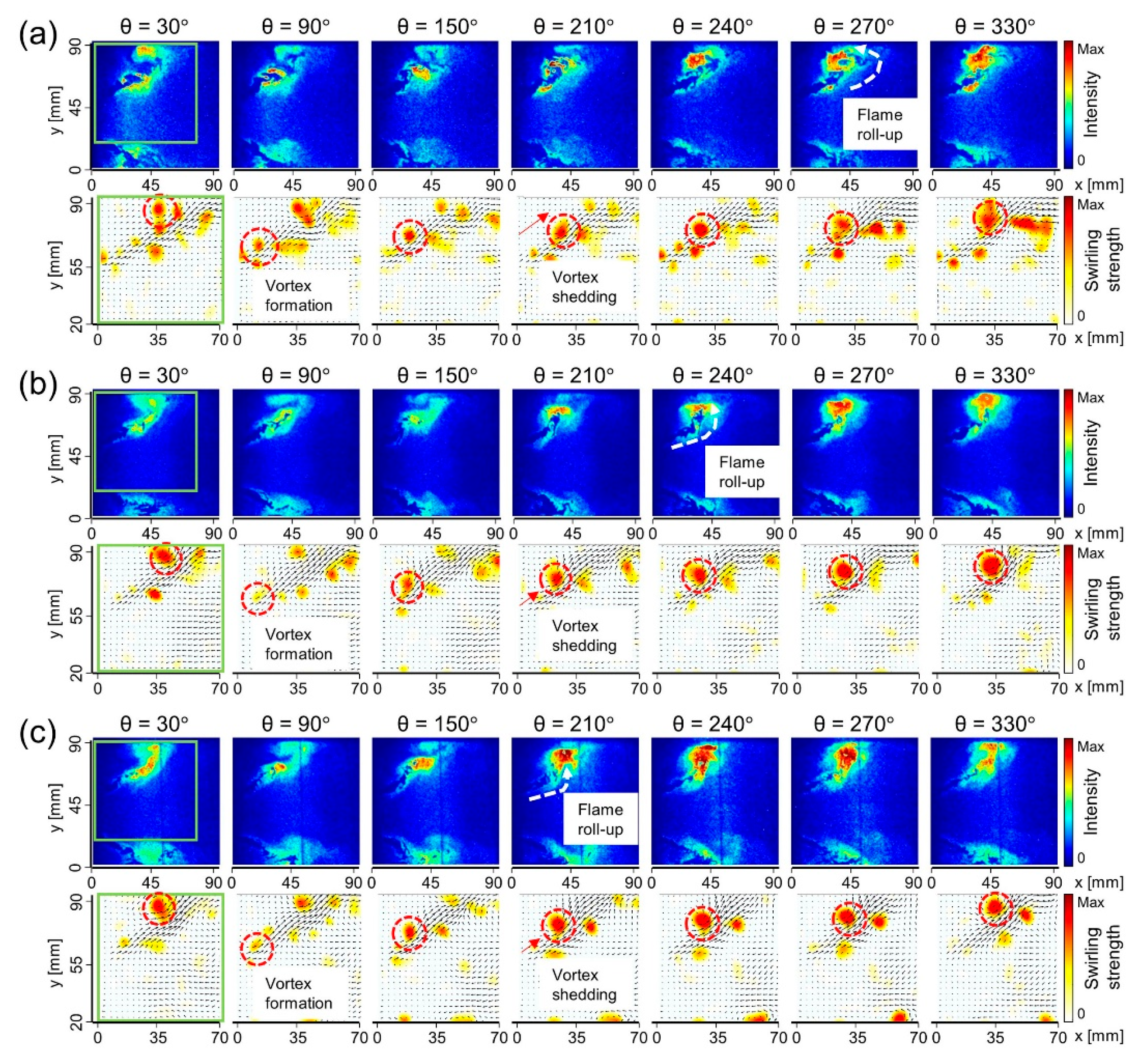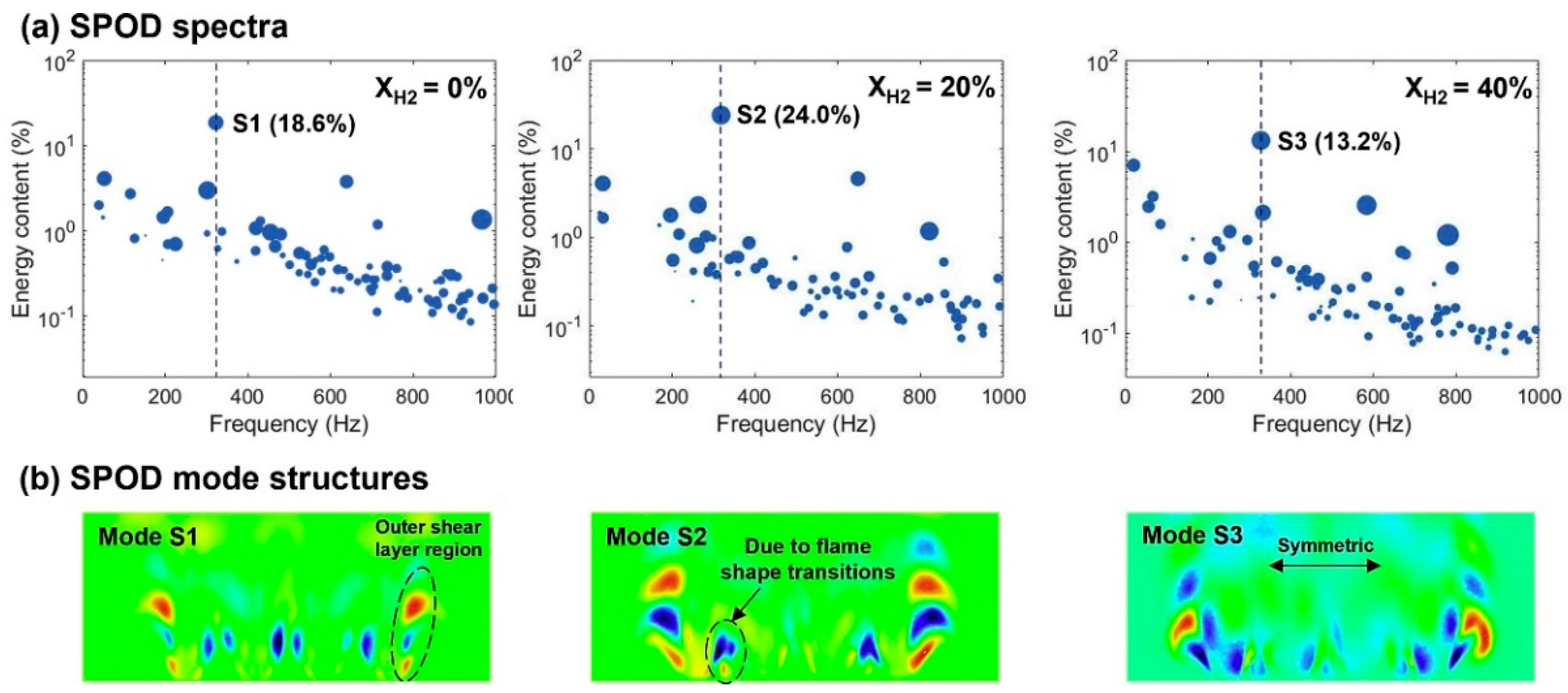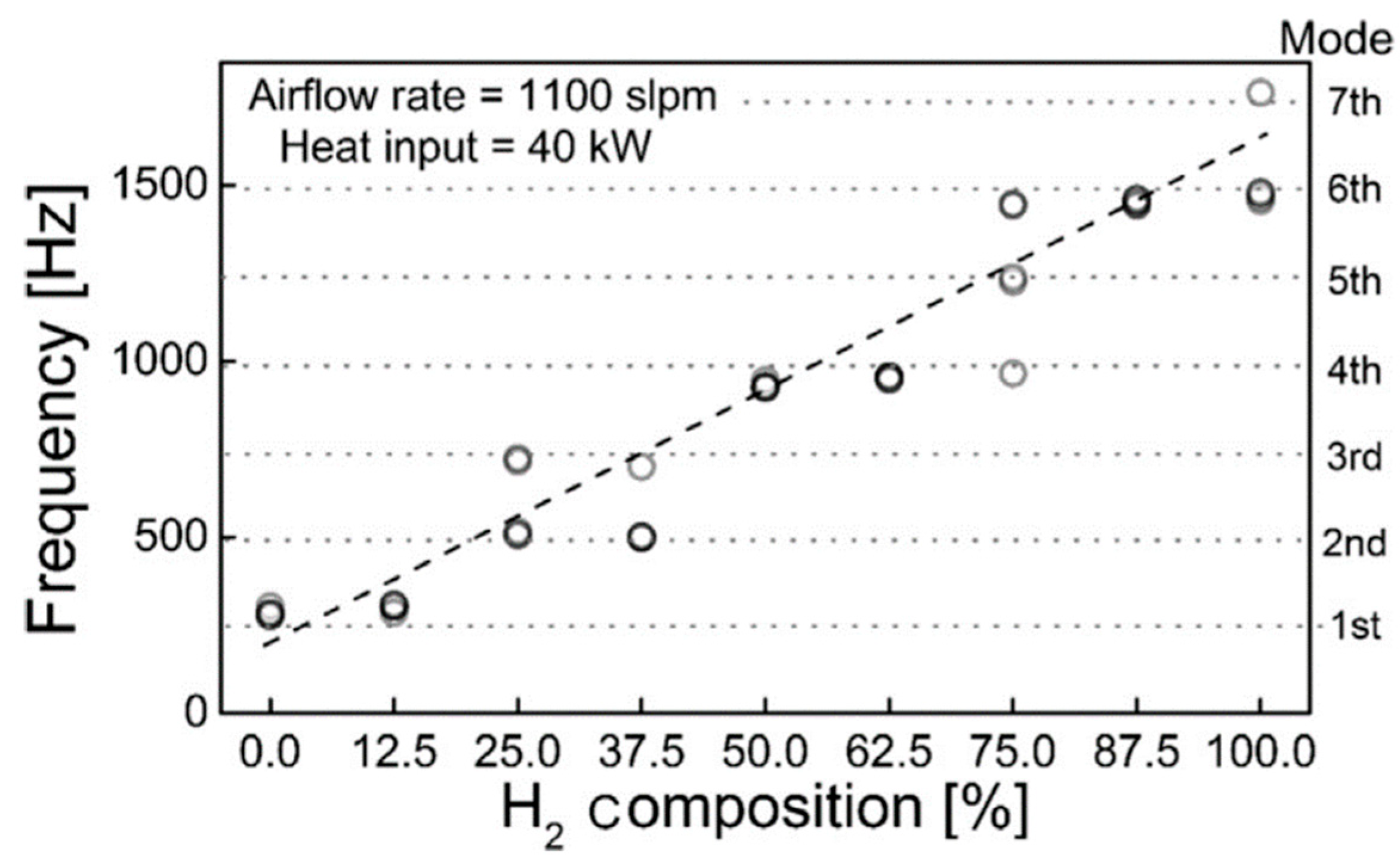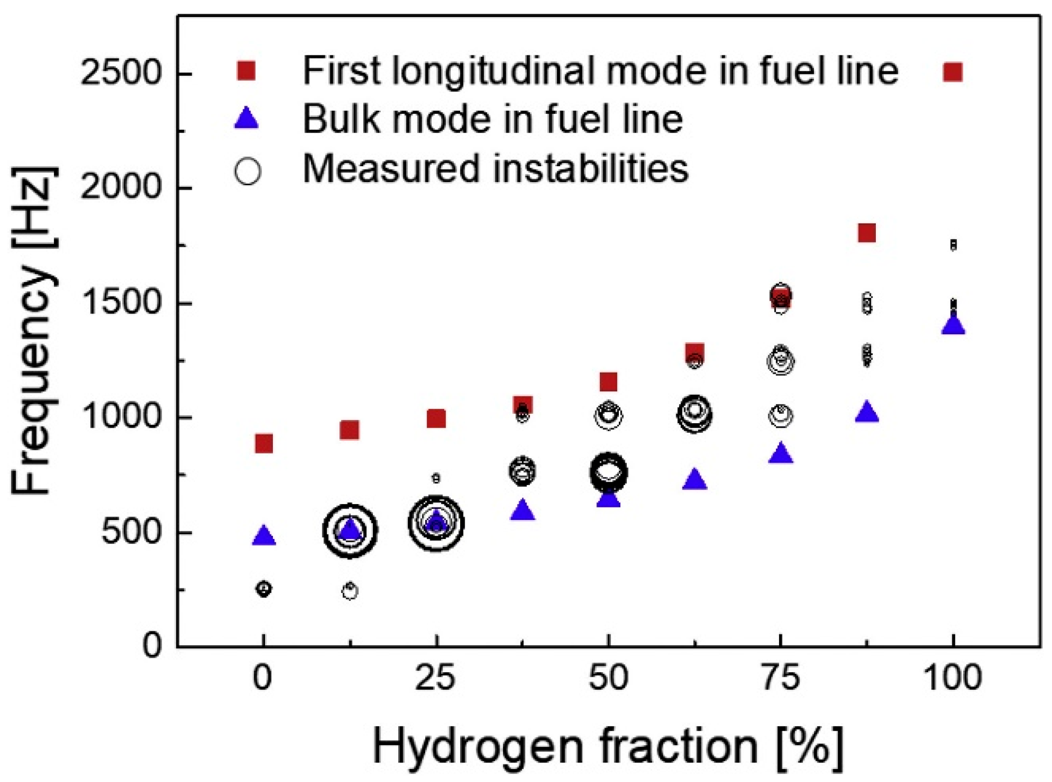 - The thresholds of hydrogen content necessary to trigger frequency shifts (a slight increase in frequency) or mode switching (transition from one mode to another) should be examined in greater detail. The effects of hydrogen addition on oscillation amplitudes should be analyzed with respect to hydrogen content, as well as combustor and nozzle structural configurations.