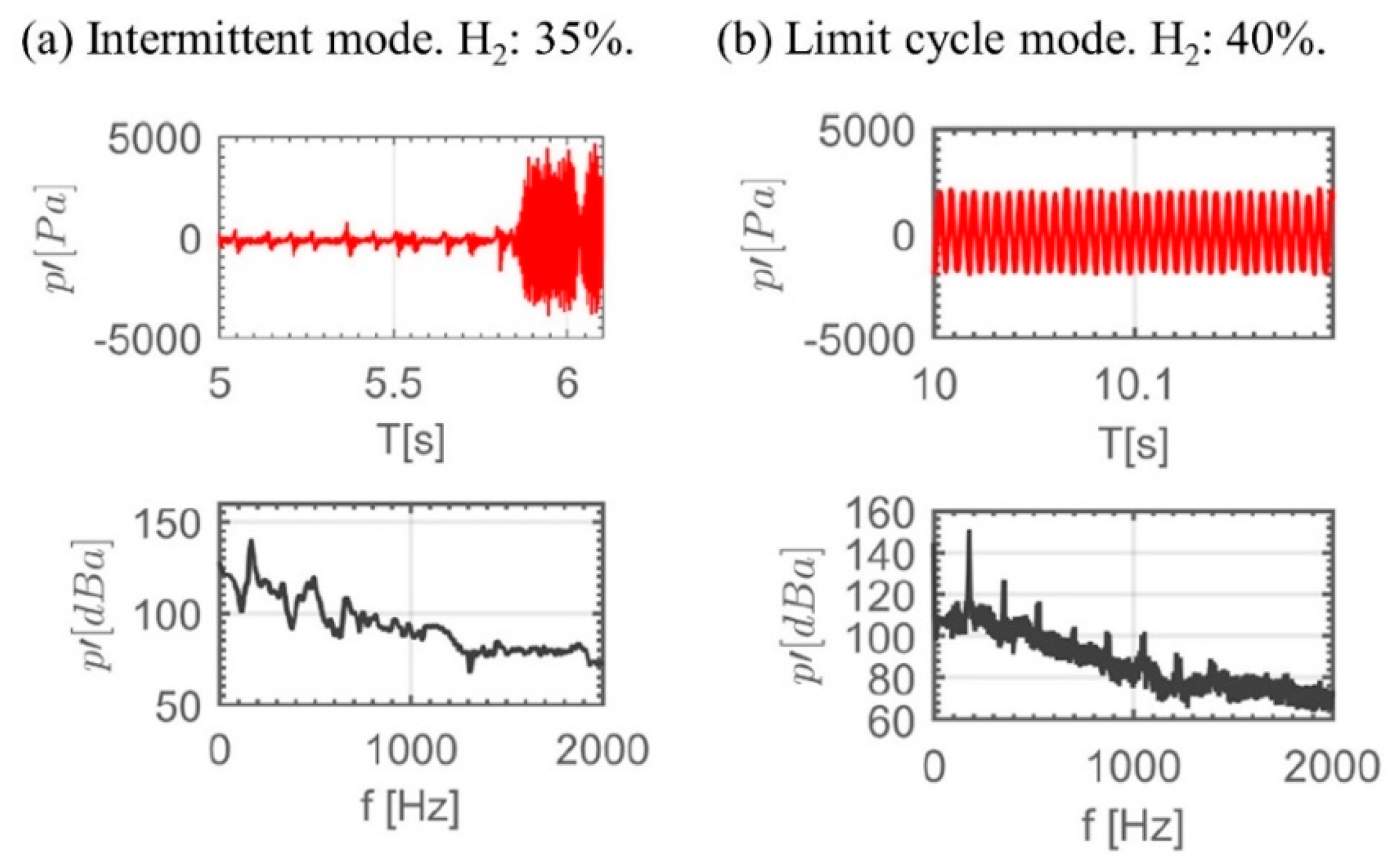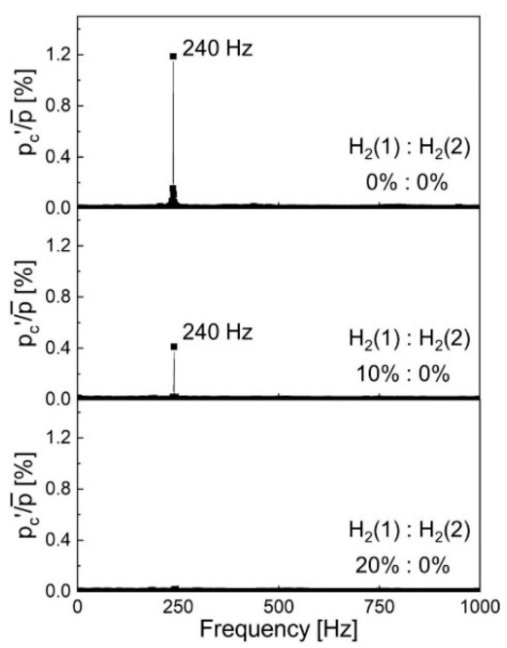 - Additional experiments are needed to explore the different oscillation modes induced by hydrogen addition. Further research should also be conducted to deepen our understanding of the nonlinear combustion dynamics of hydrogen flames at varying hydrogen concentrations.