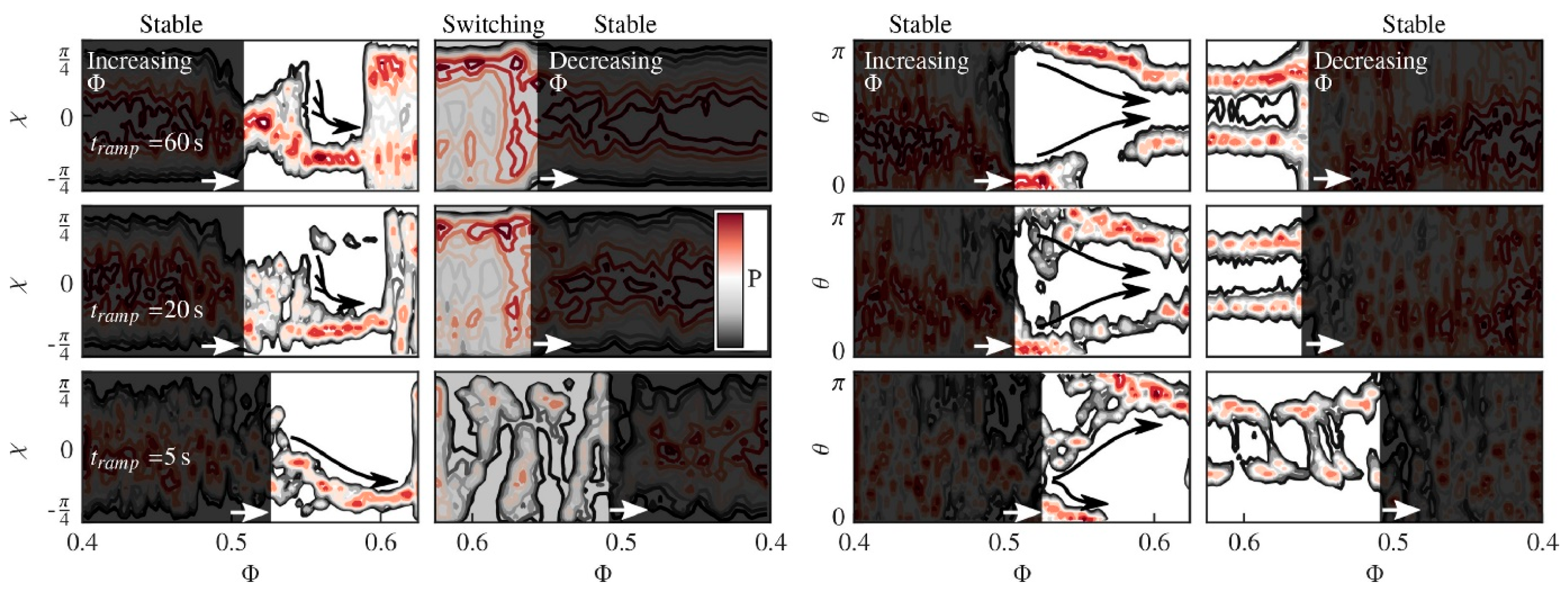 - Indlekofer, T.; Faure-Beaulieu, A.; Noiray, N.; Dawson, J. The effect of dynamic operating conditions on the thermoacoustic response of hydrogen rich flames in an annular combustor. Combust. Flame 2021, 223, 284–294. [Google Scholar] [CrossRef]