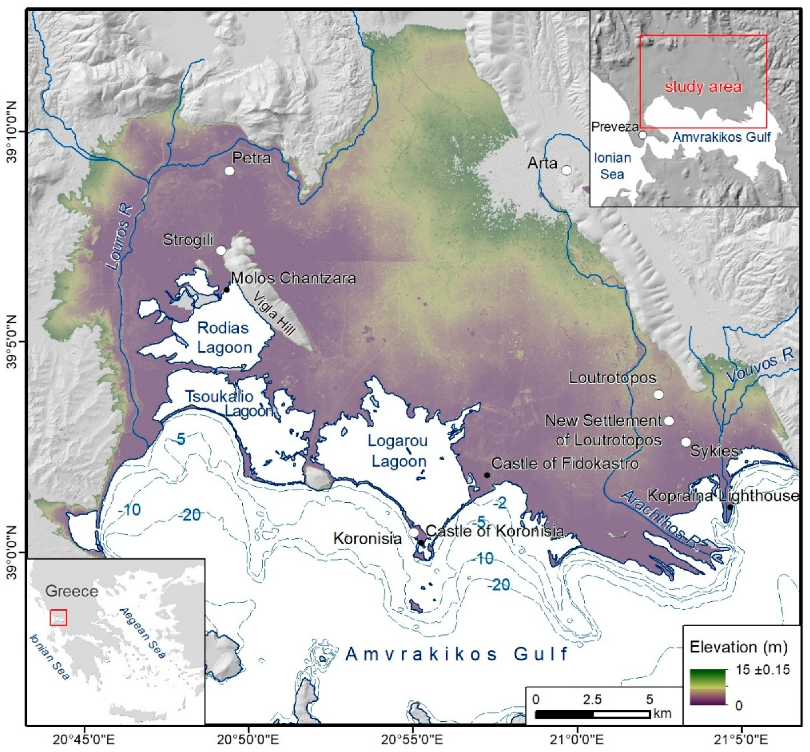 - Tziavos, C. Oceanographic Survey and Palaeogeographic Evolution of the Amvrakikos Gulf. Ph.D. Thesis, Faculty of Geology, University of Athens, Athens, Greece, 1996. [Google Scholar]