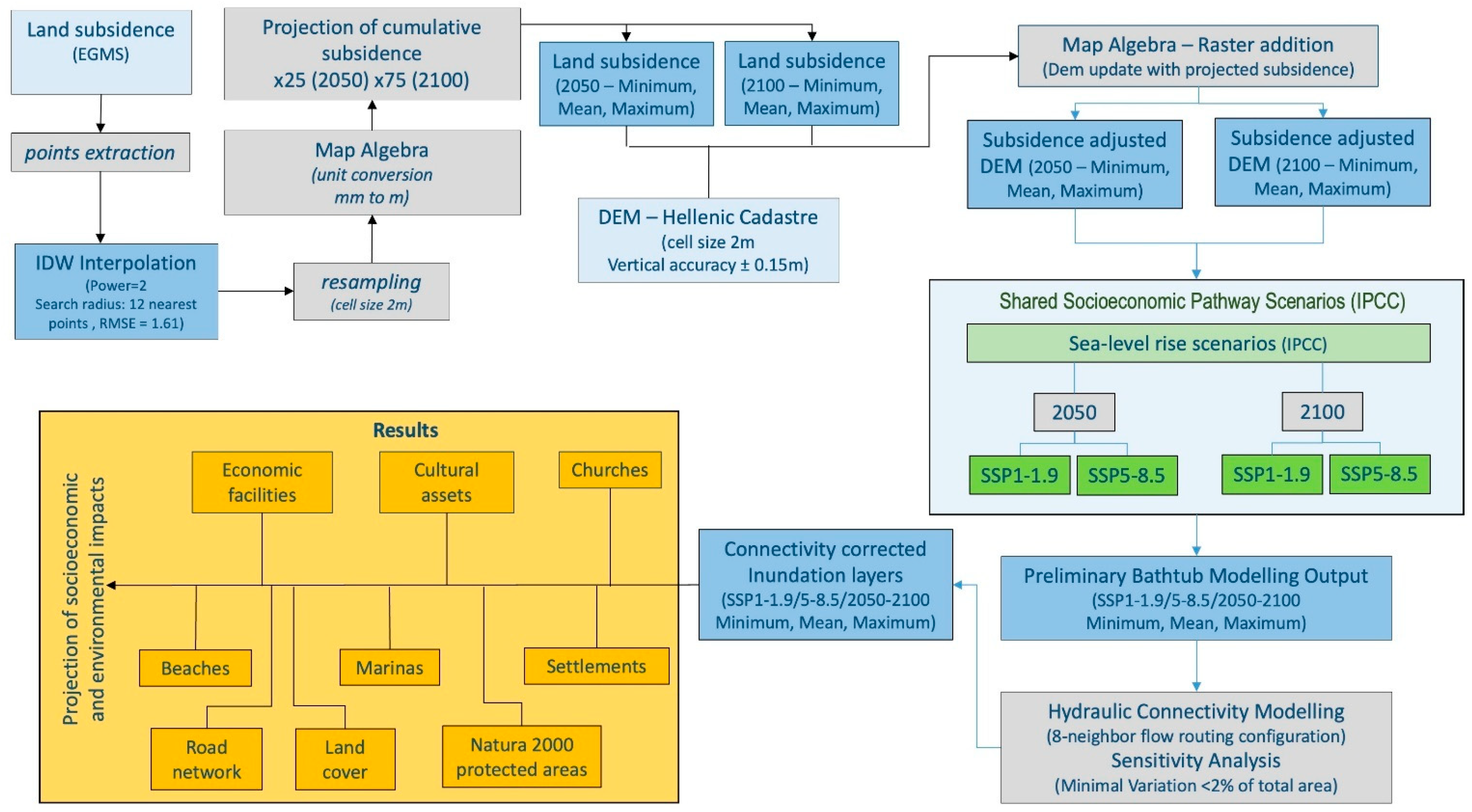 | Digital Elevation Model (DEM) | Hellenic Cadastre (Ktimatologio S.A.) | Topographic data for elevation and inundation mapping | 2 m spatial resolution, ±0.15 m vertical accuracy |