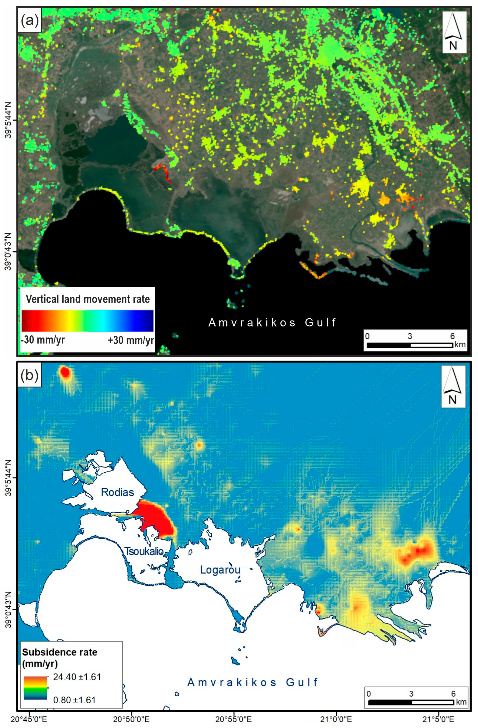 - Parcharidis, I.; Kourkouli, P.; Karymbalis, E.; Foumelis, M.; Karathanassi, V. Time Series Synthetic Aperture Radar Interferometry for Ground Deformation Monitoring over a Small Scale Tectonically Active Deltaic Environment (Mornos, Central Greece). J. Coast. Res. 2012, 29, 325–338. [Google Scholar] [CrossRef]