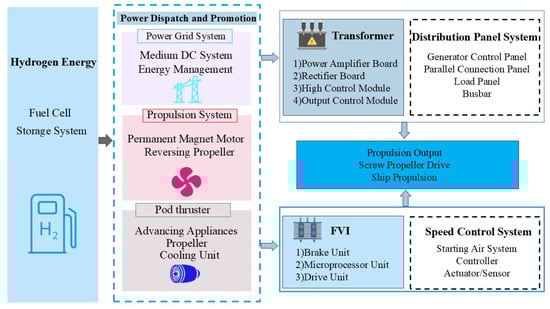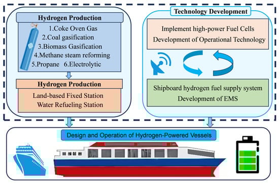 In the field of environmentally friendly clean energy, fuel cells (FCs) have become one of the most representative options [33,34]. Proton exchange membrane fuel cells (PEMFCs) are highly efficient energy converters with an energy conversion efficiency of 40–60%. Their environmental friendliness gives them broad prospects in the energy sector and global attention [35]. PEMFCs directly convert the chemical energy of hydrogen and oxygen into electrical energy through electrochemical reactions. They offer advantages such as high power density, rapid startup, low operating temperatures, and zero emissions, making them suitable for applications in transportation and other sectors [36]. In this field, the core research team has made outstanding contributions, and the design concept of hydrogen-powered ships is shown in Figure 2.