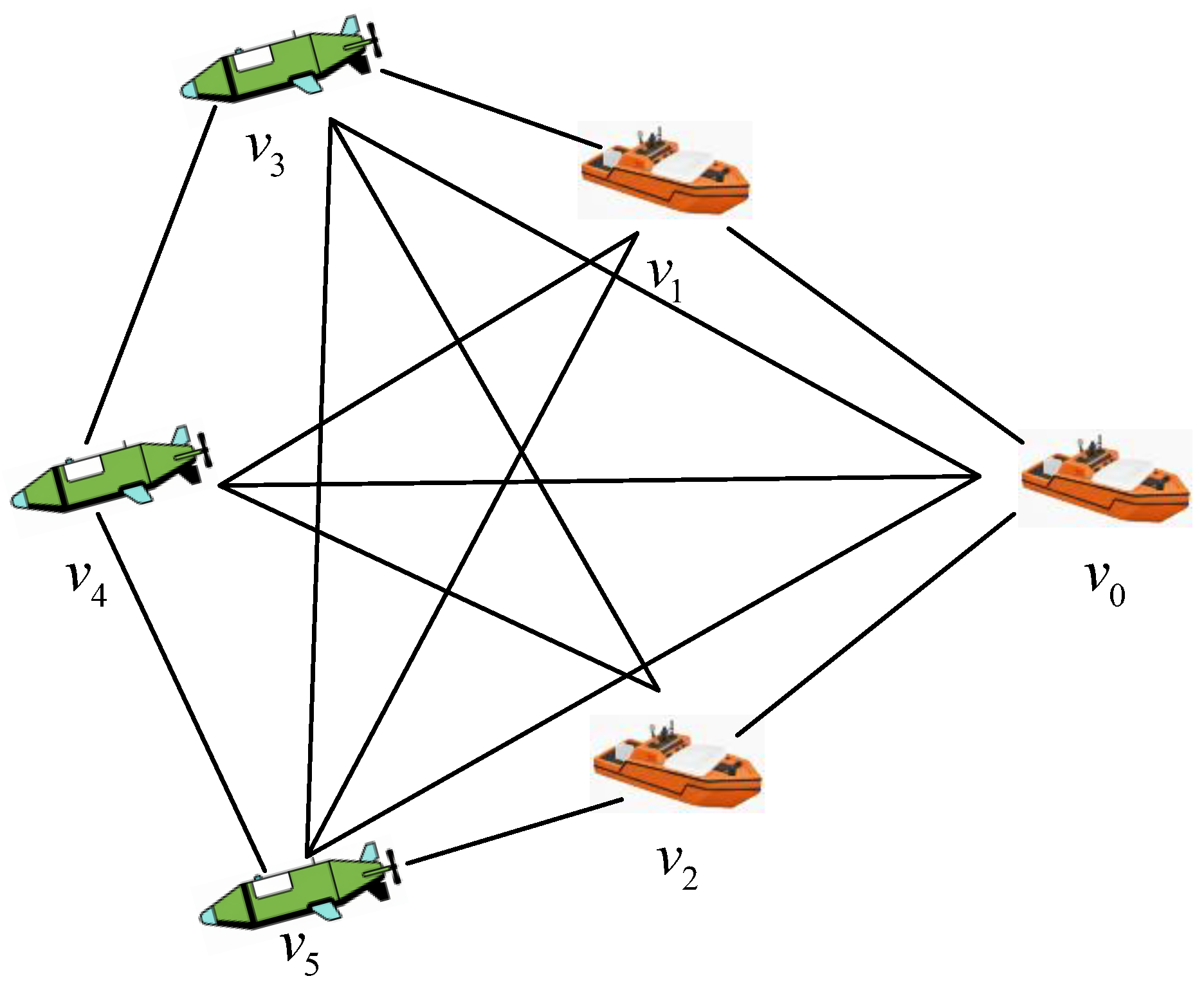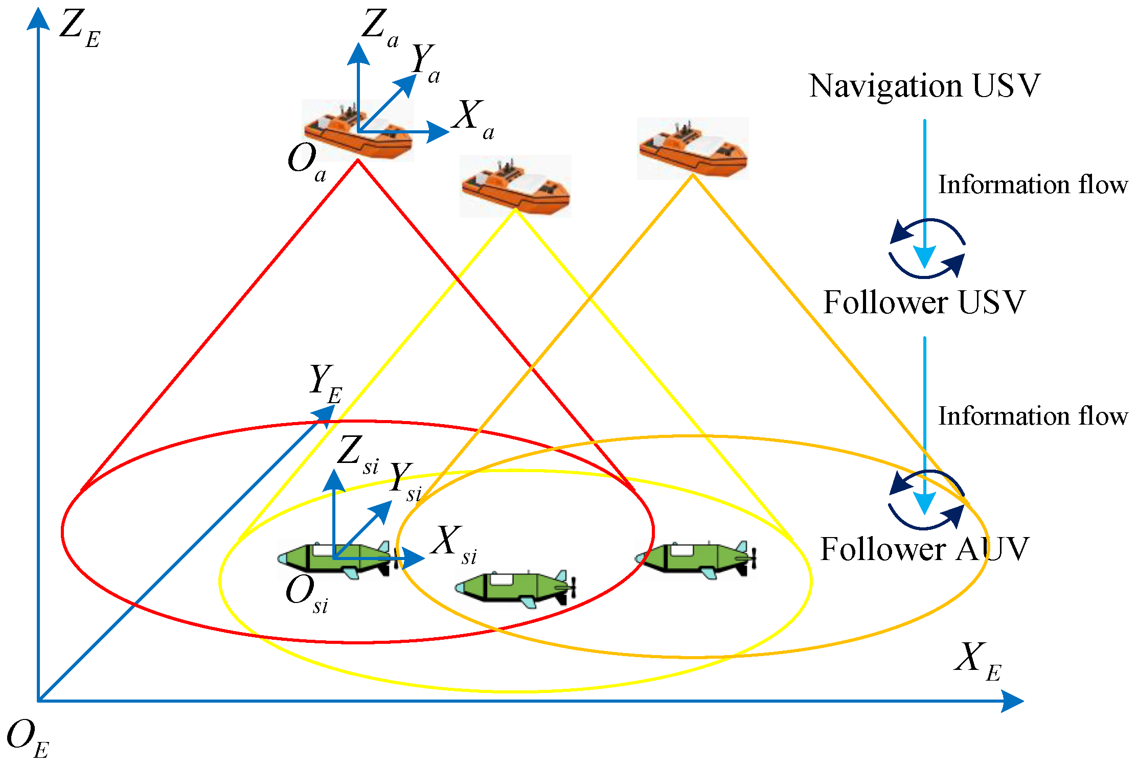 - Environment Setting: The simulation is conducted in a three-dimensional marine space. To simulate a realistic environment, a constant ocean current with a velocity of along the positive X-axis is introduced as an external disturbance term for all platforms.