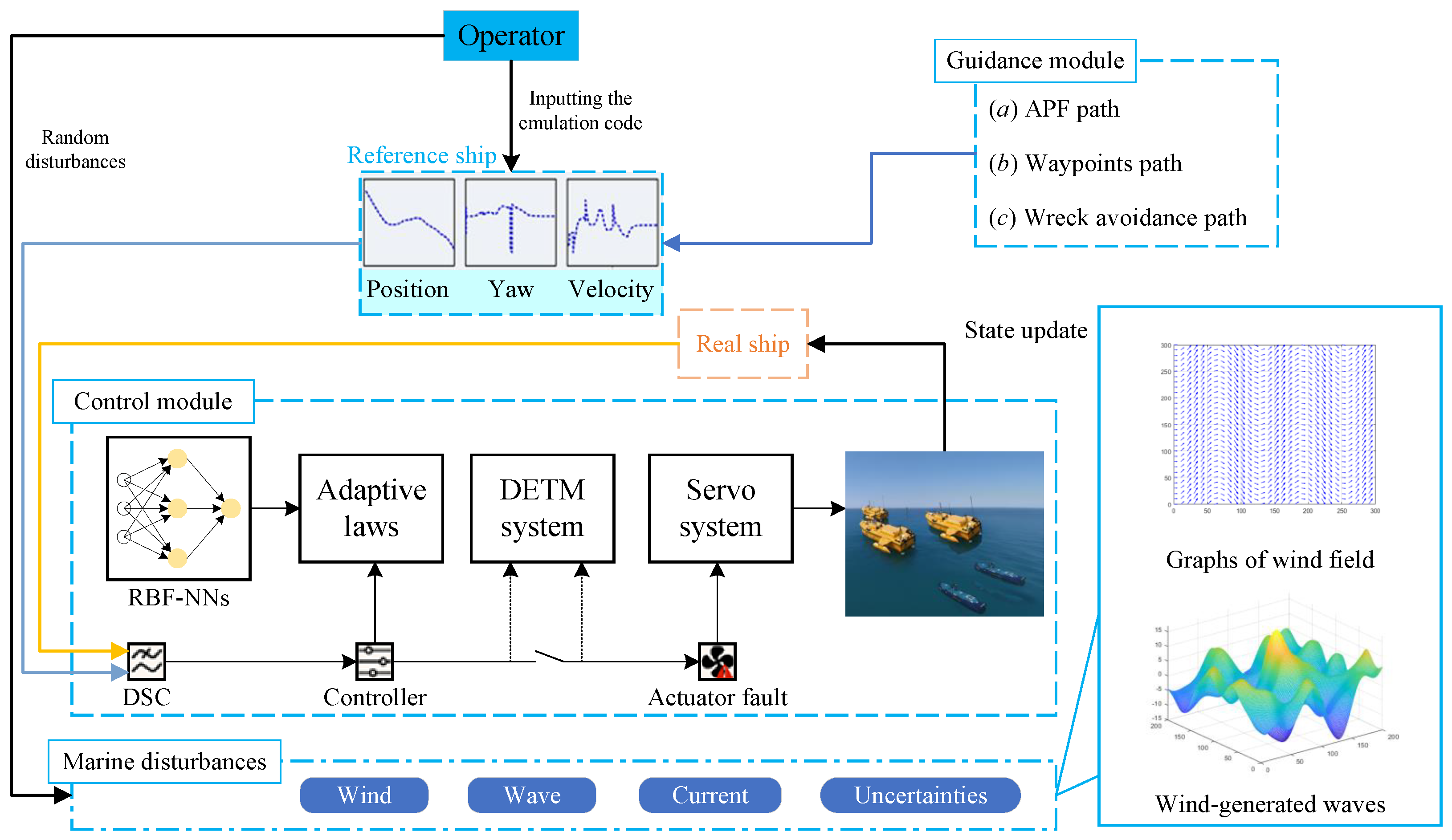 - External Disturbances: USVs are mainly affected by wind and waves, while AUVs are primarily influenced by ocean currents. The characteristics and models of these disturbances are completely different.