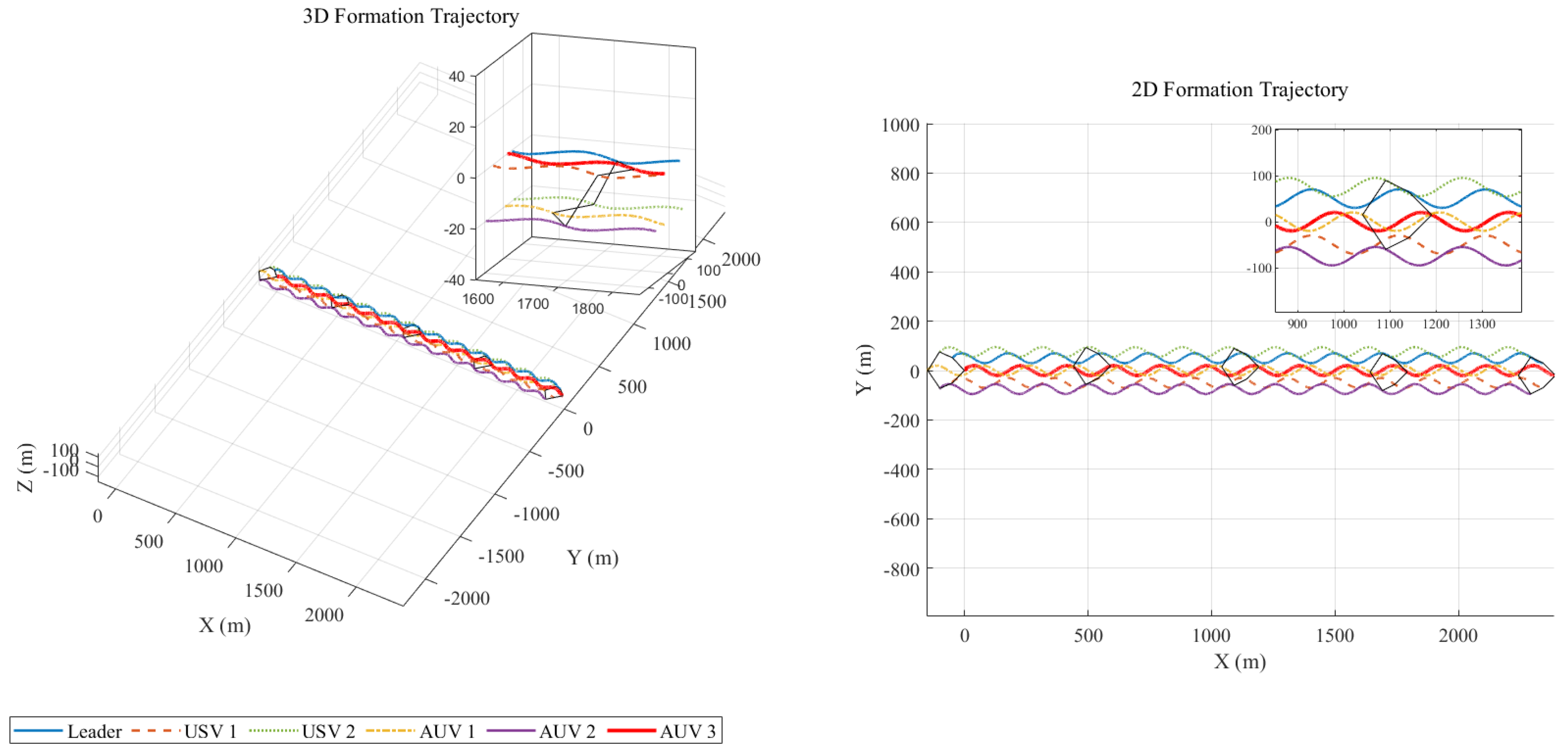 - Leader’s Trajectory: The leader USV sails along a predefined sinusoidal trajectory. Its position in the inertial frame is given by the following equation:This trajectory simulates a common reciprocating survey path.