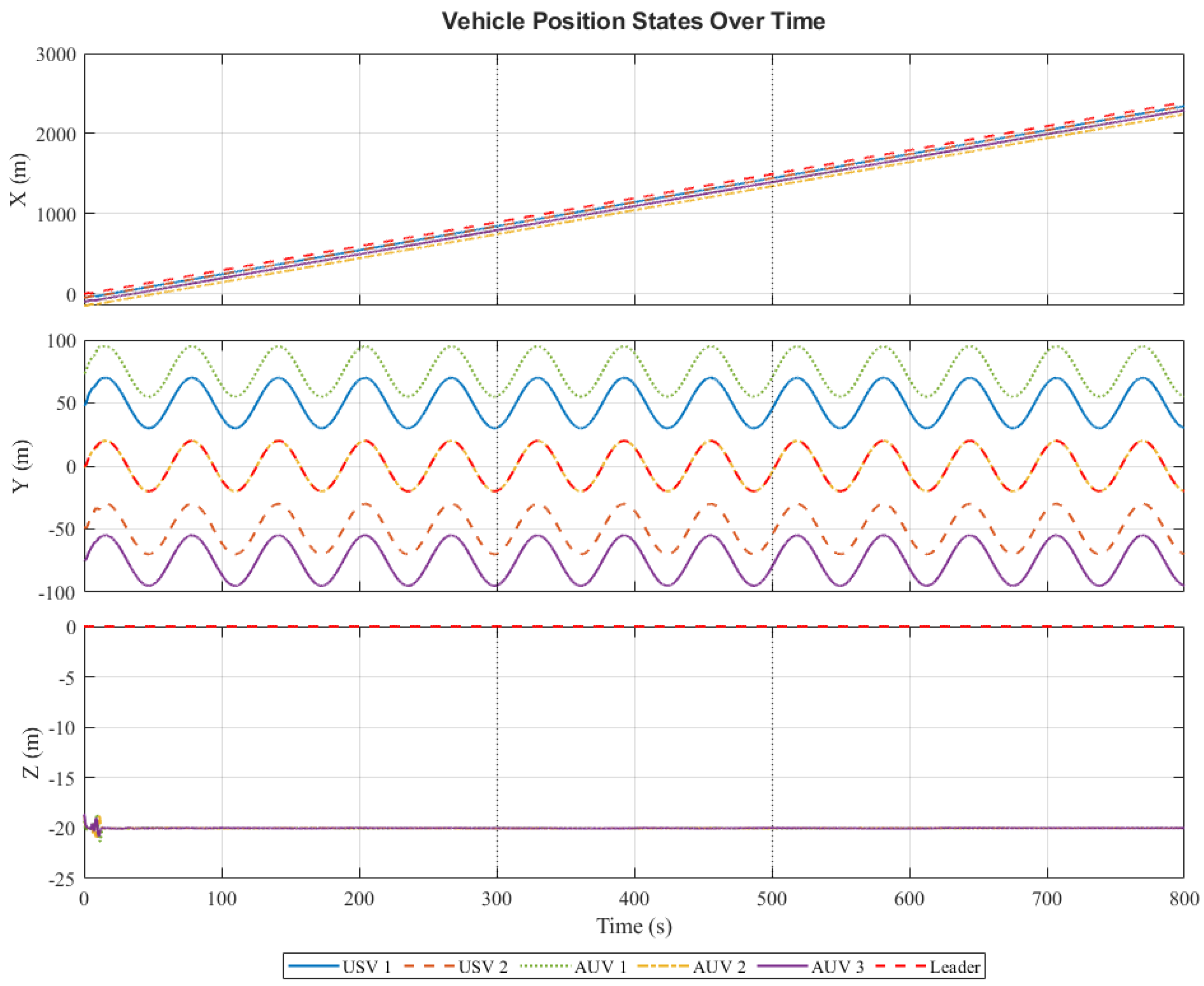 - Desired Formation: All followers are required to maintain a fixed pentagonal formation relative to the leader. The desired relative position vectors for each follower are set as follows:This formation requires the USVs to accompany on the surface, while the AUVs maintain a wider formation at a depth of 20 m, simulating a typical cross-domain collaborative operation scenario.