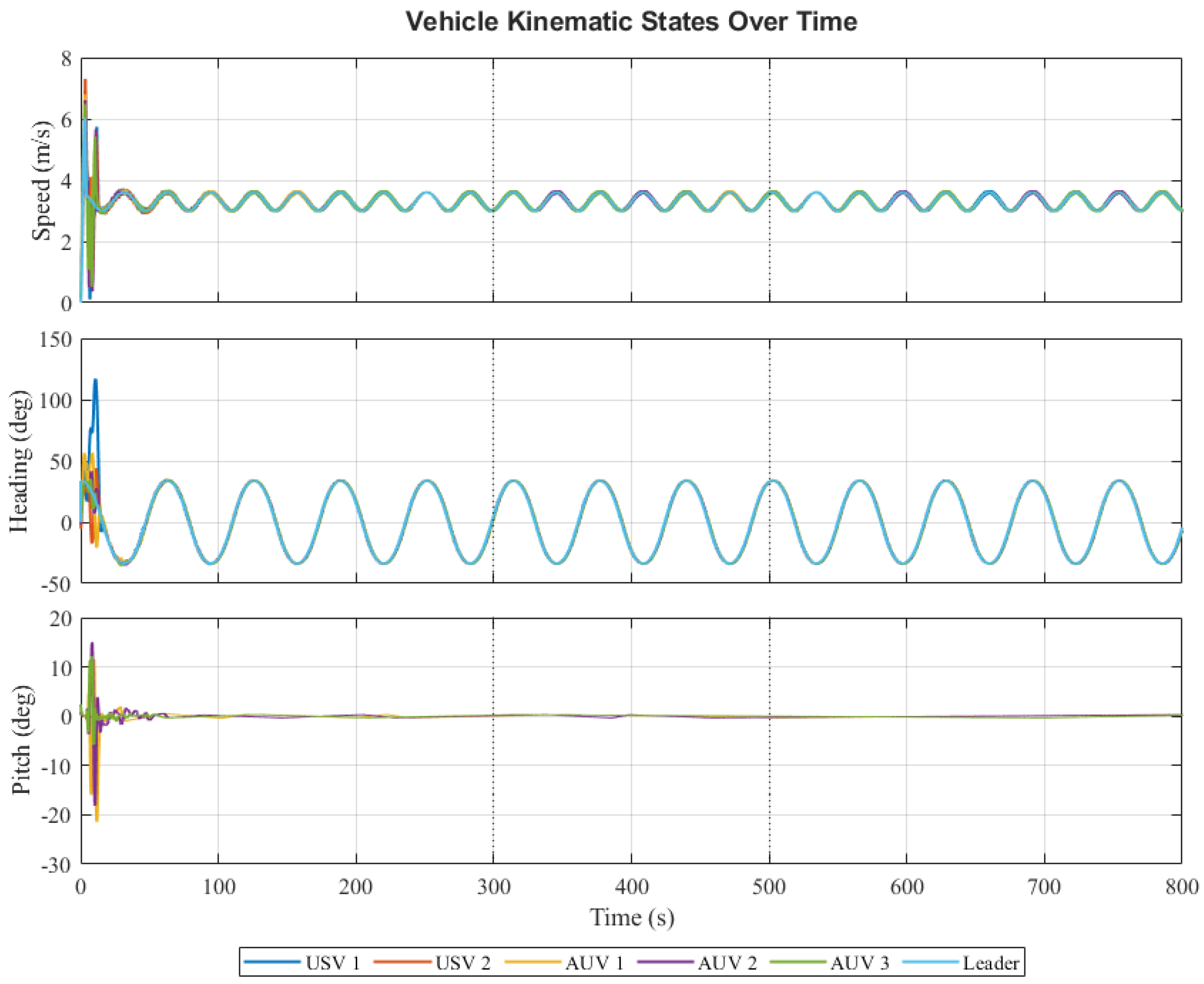 - Effectiveness Fault: At s, a 25% loss of effectiveness, a fault is injected into the main thruster of USV , meaning its effectiveness factor abruptly changes from 1 to 0.75.