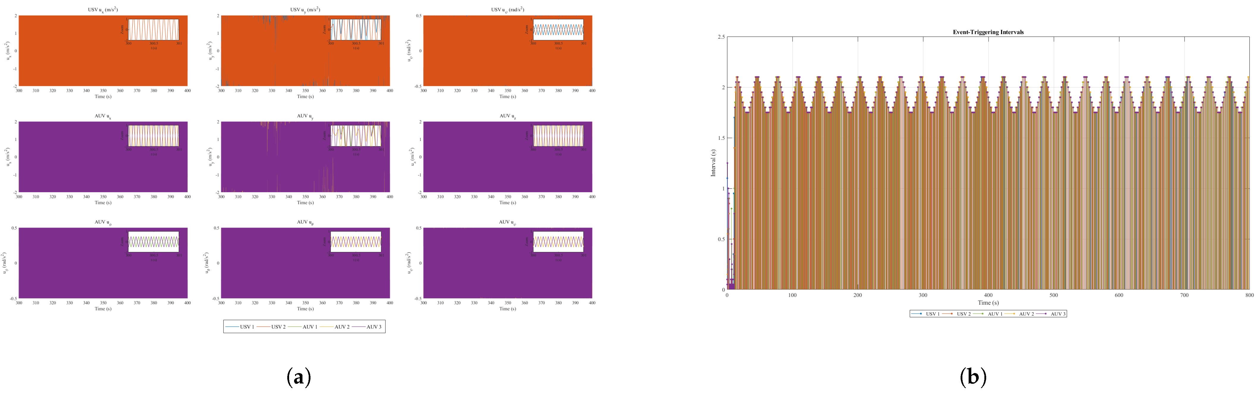 - DETM: To address the problem of limited underwater acoustic communication resources, this paper includes the design of a DETM for each agent. The triggering threshold of this mechanism is correlated with the dynamic formation error of the system, which can increase the communication frequency to ensure fast convergence when the error is large, and reduce communication to save energy when the system is stable, thereby achieving an intelligent trade-off between communication efficiency and control performance.