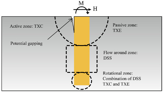 In this study, the NGI-ADP elastoplastic constitutive model was used to simulate the undrained behavior of clay soils, as described in references [16,17]. This model employs a total stress approach and is specifically designed to capture anisotropic responses by allowing direct assignment of undrained shear strengths for active (A), passive (P), and direct simple shear (D) loading modes. This capability makes it particularly well-suited for analyzing laterally loaded monopiles in clay, where the soil experiences a variety of stress conditions [18]. These include triaxial compression behind the pile, triaxial extension at shallow depths in front of the pile, direct simple shear around the center of rotation depth, and a combination of these loading modes toward the pile tip (Figure 1). Accurately capturing the soil’s response under such diverse loading paths is essential for realistic modeling. Table 2 summarizes the input parameters required for the NGI-ADP model and their descriptions.