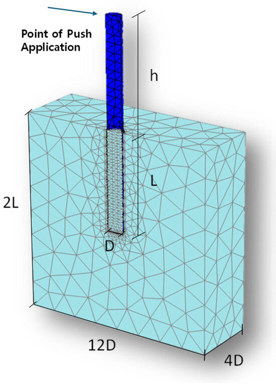 To consider strength anisotropy, the and were set to 0.5 and 0.75, respectively, while is set to 0.99 [21]. The monopile was modeled as a linear elastic material, using typical steel properties with a Young’s modulus of and Poisson’s ratio of .