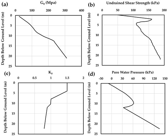 Initial soil conditions at the Cowden site: (a) small-strain shear modulus (), (b) undrained compressive shear strength (), (c) effective stress lateral earth pressure coefficient (), and (d) pore water pressure (U). Data sourced from [25,26].