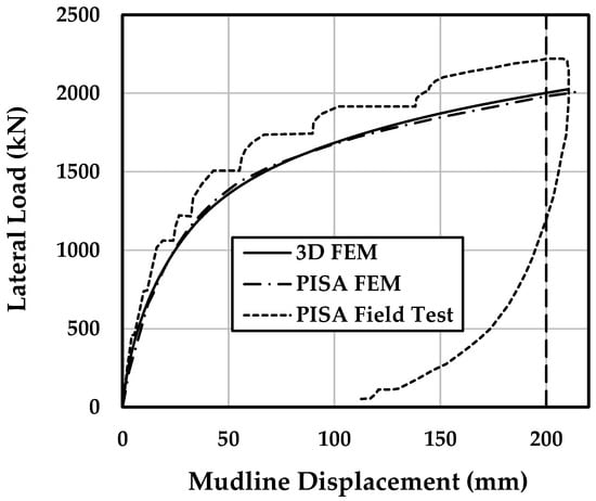 Figure 4 presents a comparison between the simulated lateral load–displacement curve and the field measurements reported in [25]. The numerical predictions align well with the observed monopile response, indicating the model’s reliability. Additional information on the modeling approach and its validation is available in [20].