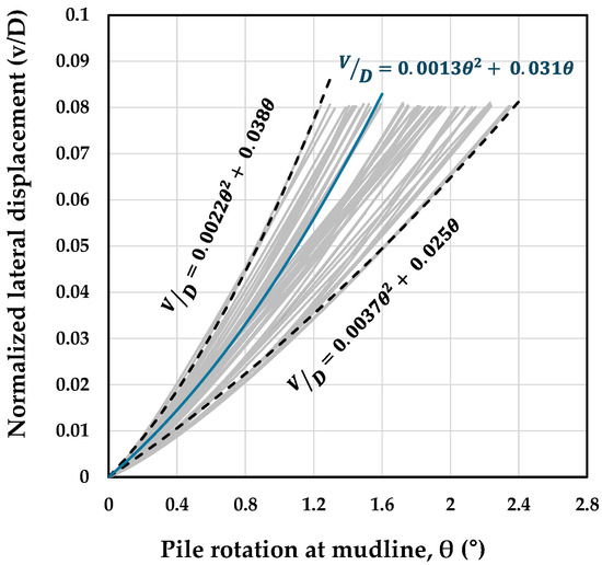 A summary of rotation and deflection values for the SLS and ULS adopted in the literature is provided in Table 3. Since these values are expressed both in terms of monopile rotation or deflection, it is useful for designers to understand their interrelation. Figure 5 presents this relationship for the analyzed cases with various diameters and L/D ratios under different soil conditions ( = 30, 60, and 180 kPa), at load eccentricities of 30 m and 80 m. The mudline deflection is normalized by pile diameter. The average relationships between normalized deflection (v/D) and rotation (θ) for these cases can be expressed using Equation (3).