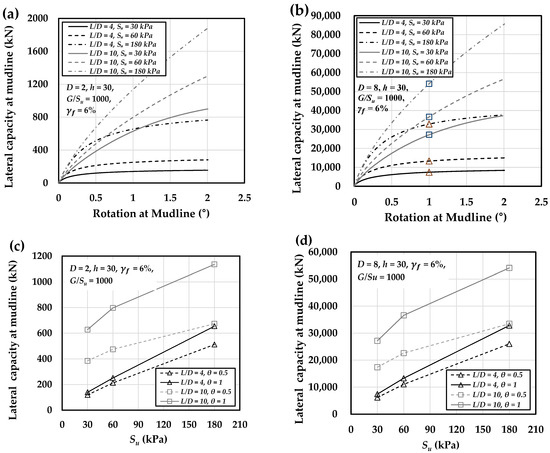Load–rotation behavior for monopiles in clay with of 30, 60, and 180 kPa: (a) 2 m and (b) 8 m diameter piles. Panels (c,d) present the corresponding lateral capacities at pile rotations of 0.5° and 1° (at mudline) for the 2 m and 8 m monopiles, respectively (The triangular and square markers at a rotation angle of 1° in (b) illustrate the points from which the lateral capacity values for L/D = 4 and 10 are derived, respectively).