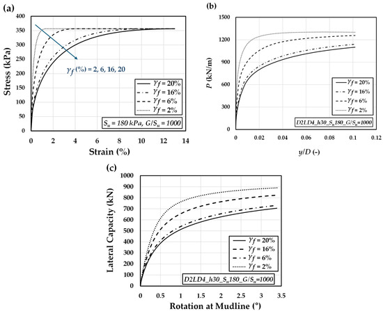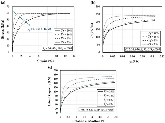 Effect of ultimate plastic shear strain () on the (a) stress–strain response, (b) p–y behavior, and (c) load–rotation performance of monopile foundations, assuming constant = 30 kPa and = 1000.