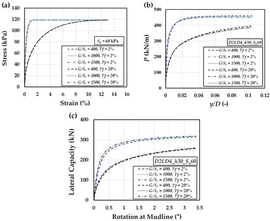 Effect of the shear modulus-to-shear strength ratio () on the (a) stress–strain response, (b) p-y behavior, and (c) load-rotation performance of a monopile foundation, for ultimate plastic strains of = 2 and 20% in constant = 60 kPa.