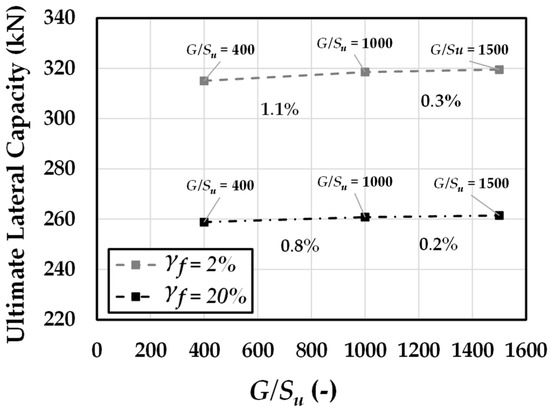 The influence of the shear modulus-to-shear strength ratio () on the stress–strain response of the soil model was evaluated for values of 400, 1000, and 1500. The undrained shear strength was kept constant at = 60 kPa, and ultimate plastic shear strains of 2% and 20% were considered. As shown in Figure 9a, the stress–strain curves indicate very limited sensitivity to changes in , with only negligible differences observed across the full range of 400 to 1500 under both plastic strain conditions. A similar trend is seen in the normalized p–y curves (Figure 9b), which show only minor variations as the ratio increases. The same behavior is also reflected in the load–rotation responses (Figure 9c), where lateral capacity remains largely unaffected, with only a small difference between = 400 and the higher ratios at rotations below 1° degree. Figure 10 further supports this observation: increasing the ratio from 400 to 1000 results in a modest 1.1% increase in ultimate lateral capacity, while raising it further to 1500 adds only 0.3%. Overall, the results demonstrate that the ratio has a negligible effect on pile response and can be reasonably disregarded when evaluating the critical pile length.