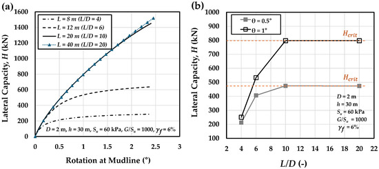 Influence of pile length (or L/D ratio) on (a) the load–rotation response and (b) the lateral capacity (H) at pile head rotations of θ = 0.5° and 1°, for a 2 m diameter monopile embedded in the representative clay ( = 60 kPa, = 6%, and = 1000) and loaded at 30 m above the mudline.