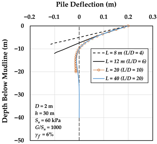 To investigate how pile length influences lateral pile deflection and to clarify the emergence of a critical lateral capacity , Figure 12 presents the lateral deflection profiles of piles embedded in the representative clay profile (as introduced in Figure 11) under a lateral pile head displacement of 0.1D (0.2 m). For short piles with a low slenderness ratio (L/D = 4), the response is dominated by rigid-body rotation. As the pile length—and consequently the slenderness ratio—increases, the structural response transitions from rigid body rotation to a combination of bending and rotation, indicating increased flexibility. This bending behavior intensifies with further lengthening until a critical length of about L = 20 m is reached. At this point, the pile behaves similarly to a clamped beam, exhibiting negligible toe displacement. For longer piles (e.g., L = 40 m, L/D = 20), the deflection profile in the upper half mirrors that of the 20 m pile, while the bottom half remains effectively undeformed.