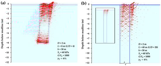 Vector plots illustrating soil displacement around a 2 m-diameter monopile in the representative soil profile, shown for two cases: (a) L = 8 m (L/D = 4) and (b) L = 40 m (L/D = 20). Displacements are magnified fivefold for visualization.