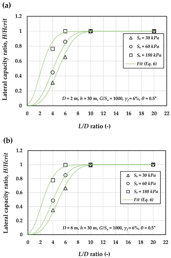 Normalized critical pile length ratios () for the analyzed cases, determined using the proposed fit (Equation (6)).