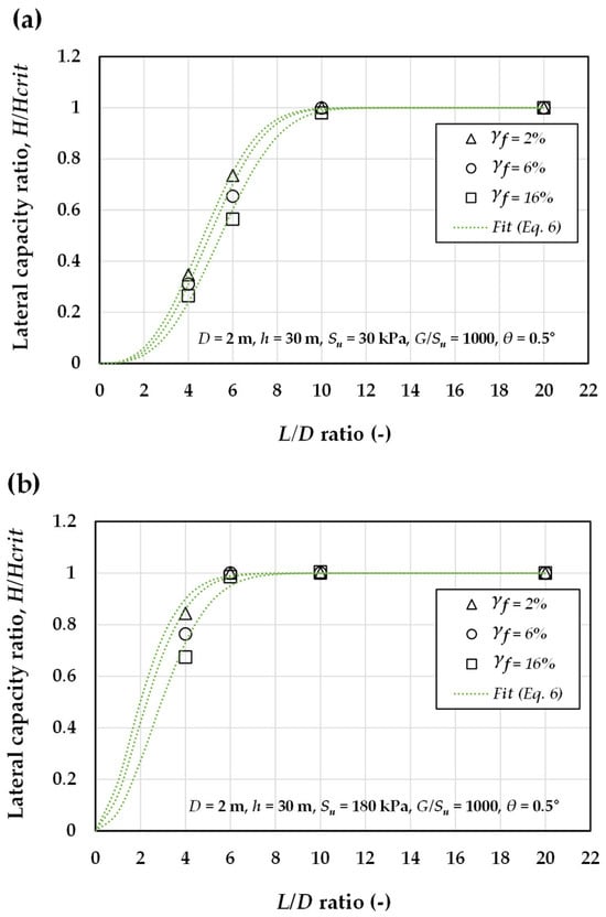 Both an increase in undrained shear strength and a decrease in ultimate plastic shear strain contribute to a reduction in the critical pile length. This is because, as the surrounding soil becomes stronger and stiffer, the pile can resist the applied lateral load and moment at shallower depths by mobilizing resistance over a shorter length, thereby reaching the critical pile length at a reduced embedment depth. In other words, higher or lower accelerates the convergence of the () ratio toward unity with respect to (L/D), resulting in a smaller normalized critical pile length (). Furthermore, a similar trend is observed in Figure 16a,b for rotation angles of 0.5° and 1°, respectively. However, the results indicate that the critical pile length increases with greater pile head rotation.