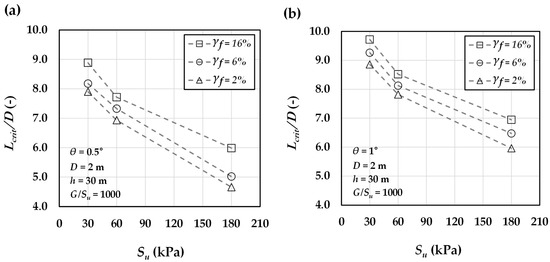 Figure 16 illustrates the variation in normalized critical length () with the undrained shear strength of clay for a pile with a 2 m diameter, evaluated under different levels of ultimate plastic shear strain. As shown in Figure 16a,b, corresponding to a rotation angle of 0.5° and 1°, an increase in undrained shear strength () leads to a reduction in . Moreover, higher levels of ultimate plastic shear strain result in larger values of . This trend is evident in Figure 16a,b, where increasing the plastic strain from 2% to 16% consistently increases across the cases considered.