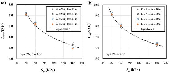 Additionally, to examine the accuracy of Equation (7) in predicting the critical pile length, multiple numerical models—independent of those utilized in formula derivation—were developed, as presented in Table 6. The critical pile lengths of these cases were then obtained and compared against the predictions of Equation (7). The FE analyses and Equation (7) predictions showed an average deviation of only 2.8% across the investigated ranges—pile diameters (D) of 2–8 m, load eccentricities (h) of 30–80 m, undrained shear strengths () of 30–180 kPa, ratios of small-strain shear modulus to undrained shear strength () of 400–1500, and ultimate plastic shear strains () of 2–16%—demonstrating good consistency of the proposed formulation despite some parameters exceeding these ranges.