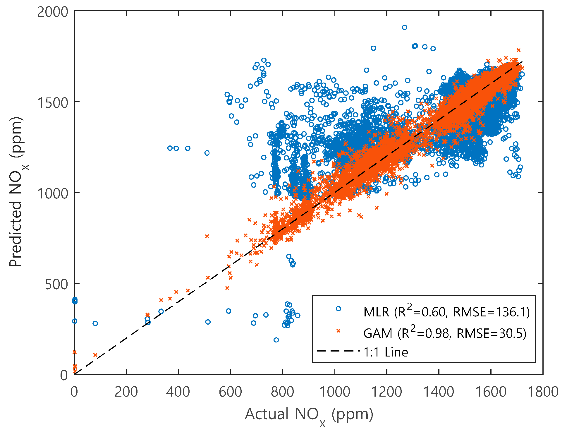 where y represents the response variable (e.g., NOx), Xi represents the predictor variables, and ϵ represents the residual error term. The model performance was evaluated by using the coefficient of determination (R2) and root mean square error (RMSE).