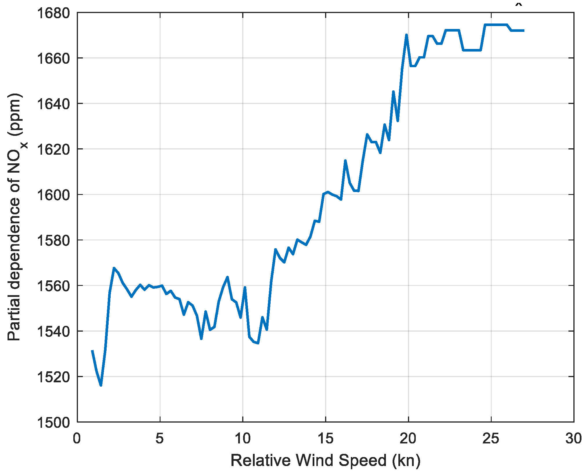 The relative wind conditions also directly influenced pollutant emissions. Headwinds increased the hull resistance and SFOC, which elevated the in-cylinder temperature and pressure and sharply increased NOx emissions. Tailwinds reduced the hull resistance and SFOC, which lowered NOx, SO2, and CO2 emissions. The average NOx concentration was 845 ppm under headwinds, 712 ppm with beam winds, and 655 ppm with tailwinds. Similar patterns were observed for the SO2 and CO2 emissions. In particular, the NOₓ emissions exhibited a nonlinear escalation beyond a relative wind speed (RWS) of approximately 12 kn, reflecting intensified thermal-NOₓ formation at higher combustion temperatures. This threshold was quantitatively derived from the GAM partial-dependence analysis, where the second derivative of the fitted smooth term for RWS changed sign at about 11.8–12.2 kn (p < 0.01). The result confirms that the 12-kn limit is data-driven rather than visually inferred, representing a statistically significant inflection point at which NOₓ emissions begin to rise sharply.